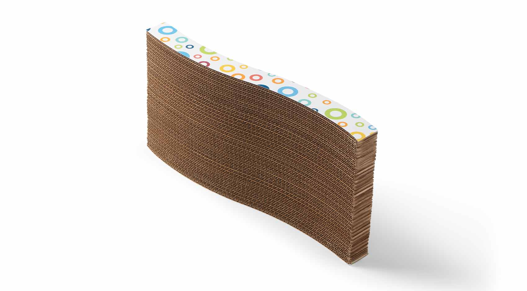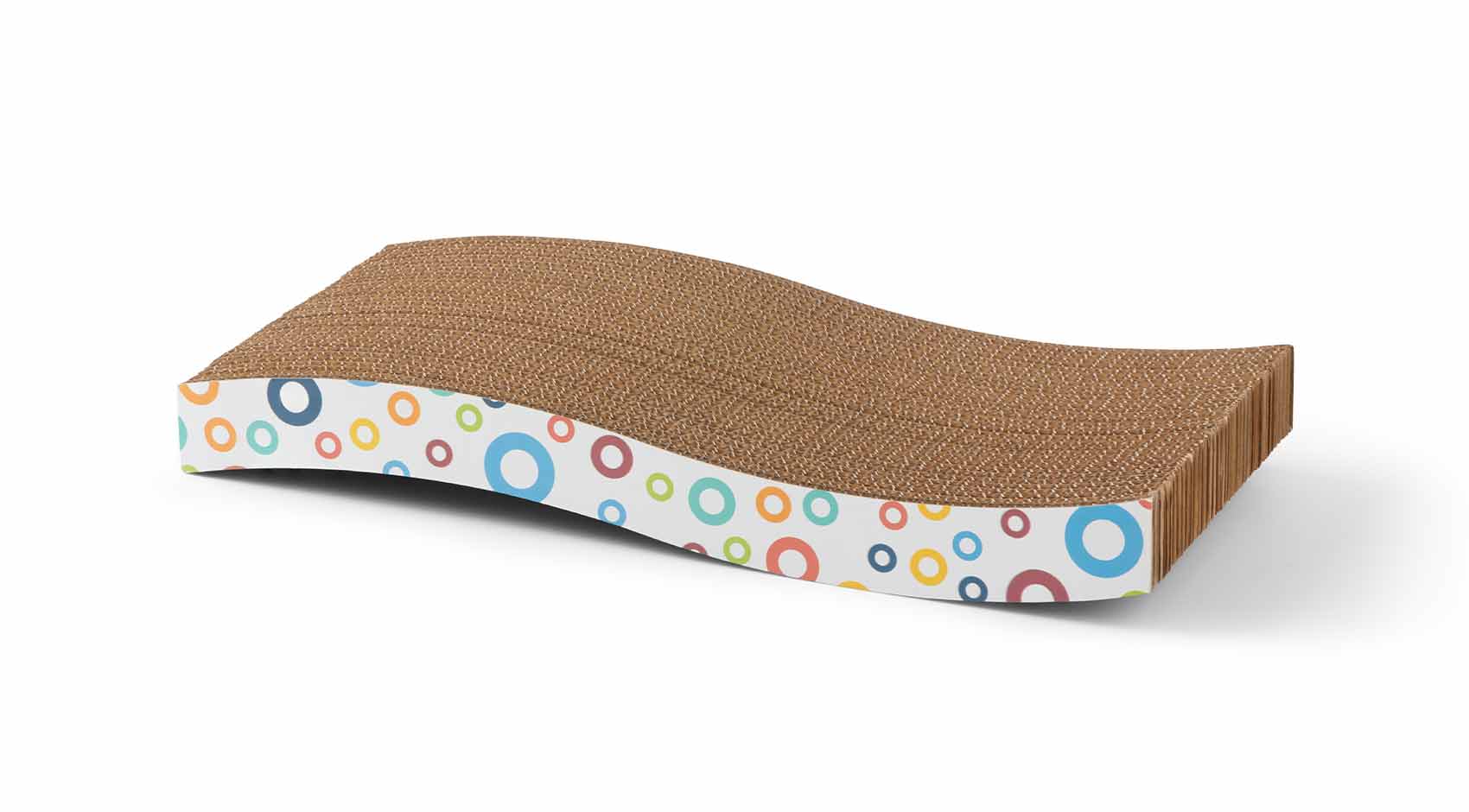 Zakrzywiony tekturowy drapak dla kota z falistą strukturą, z jednej strony pokryta kolorowym wzorem z jasnych kółek. Ten ergonomiczny kształt zapewnia kotu wygodne miejsce do ostrzenia pazurów. Razem z drapakiem w zestawie znajduje się kocimiętka, która przyciągnie uwagę kota i zwiekszy jego zainteresowanie nowym produktem.