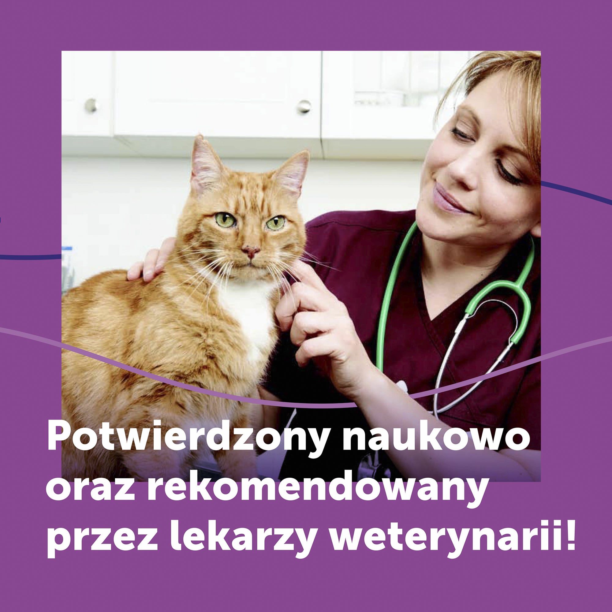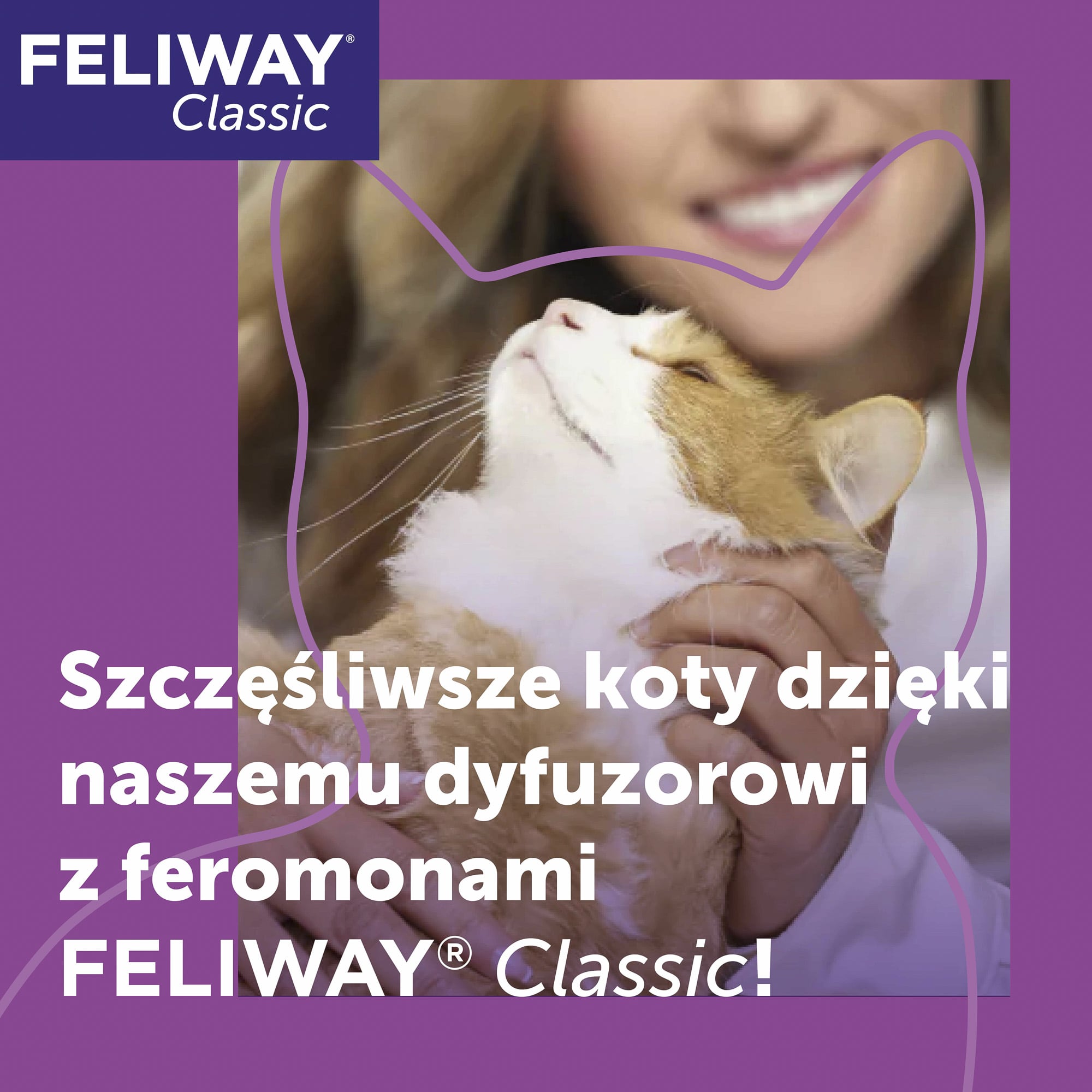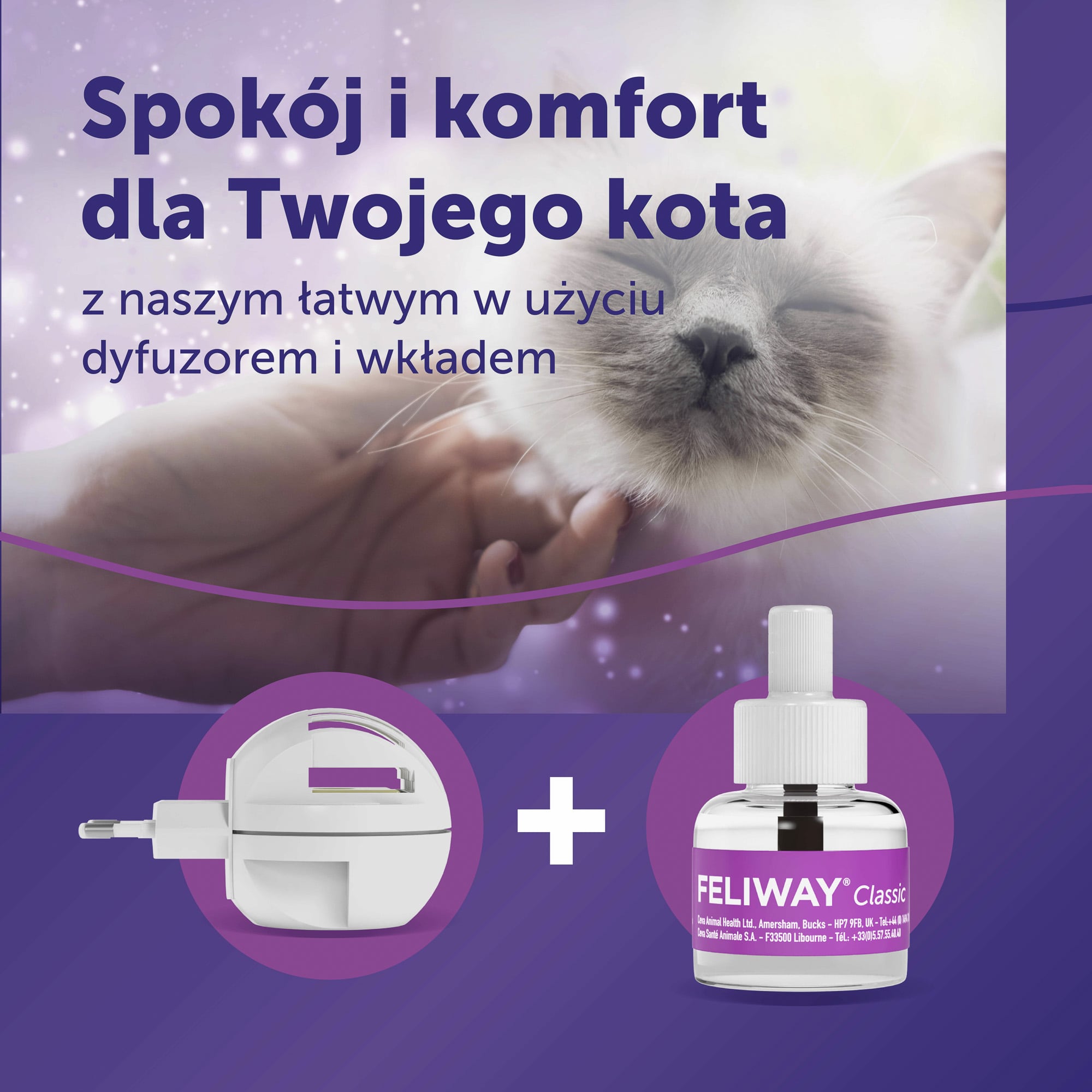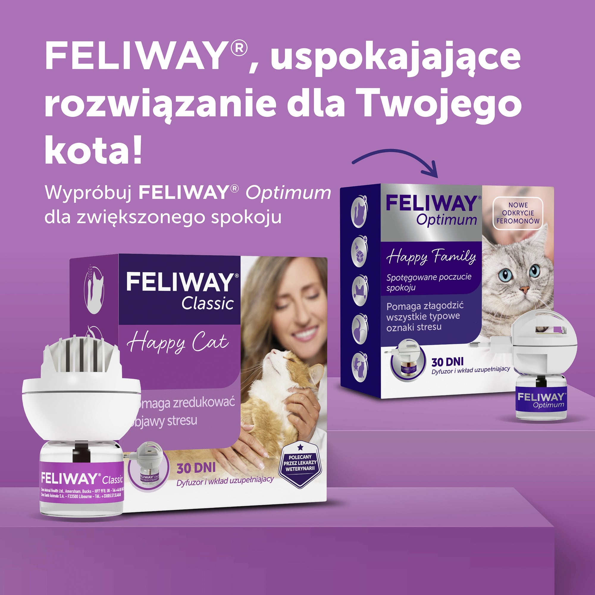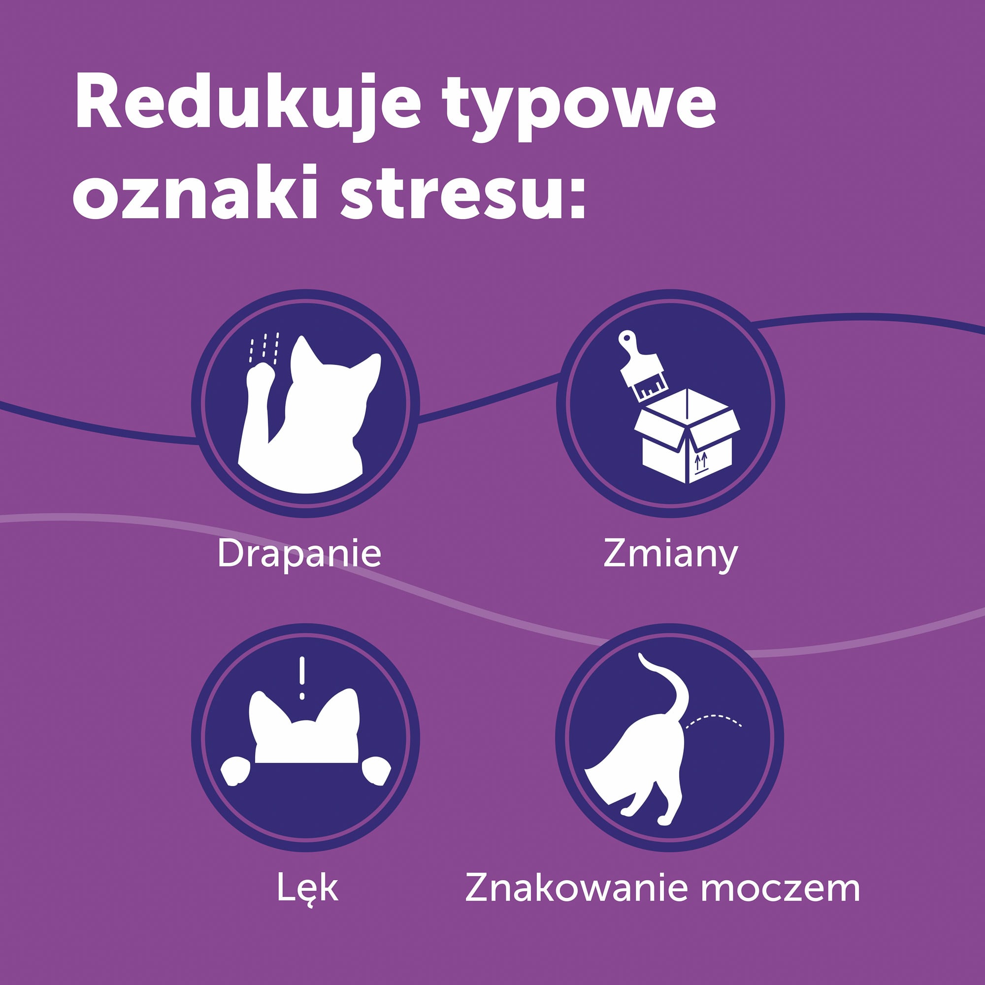 Feliway Classic jest szczególnie skuteczny w stresujących sytuacjach, takich jak przeprowadzka, remont, przemeblowanie czy pojawienie się nowego zwierzęcia lub dziecka w domu. Preparat wspiera koty wykazujące objawy stresu: załatwiające się poza kuwetą, niszczące meble przez drapanie, chowające się, wykazujące obniżoną aktywność, brak apetytu czy nadmierne wylizywanie się. Doskonale sprawdza się również w domach z kilkoma kotami, które nie dogadują się ze sobą – pomaga łagodzić agresję ze stresu, blokowanie się nawzajem czy napięte wpatrywanie się. Produkt jest także pomocny w uspokojeniu kota podczas transportu, wizyt u weterynarza, w sylwestra czy przy przyzwyczajaniu do hałasów.