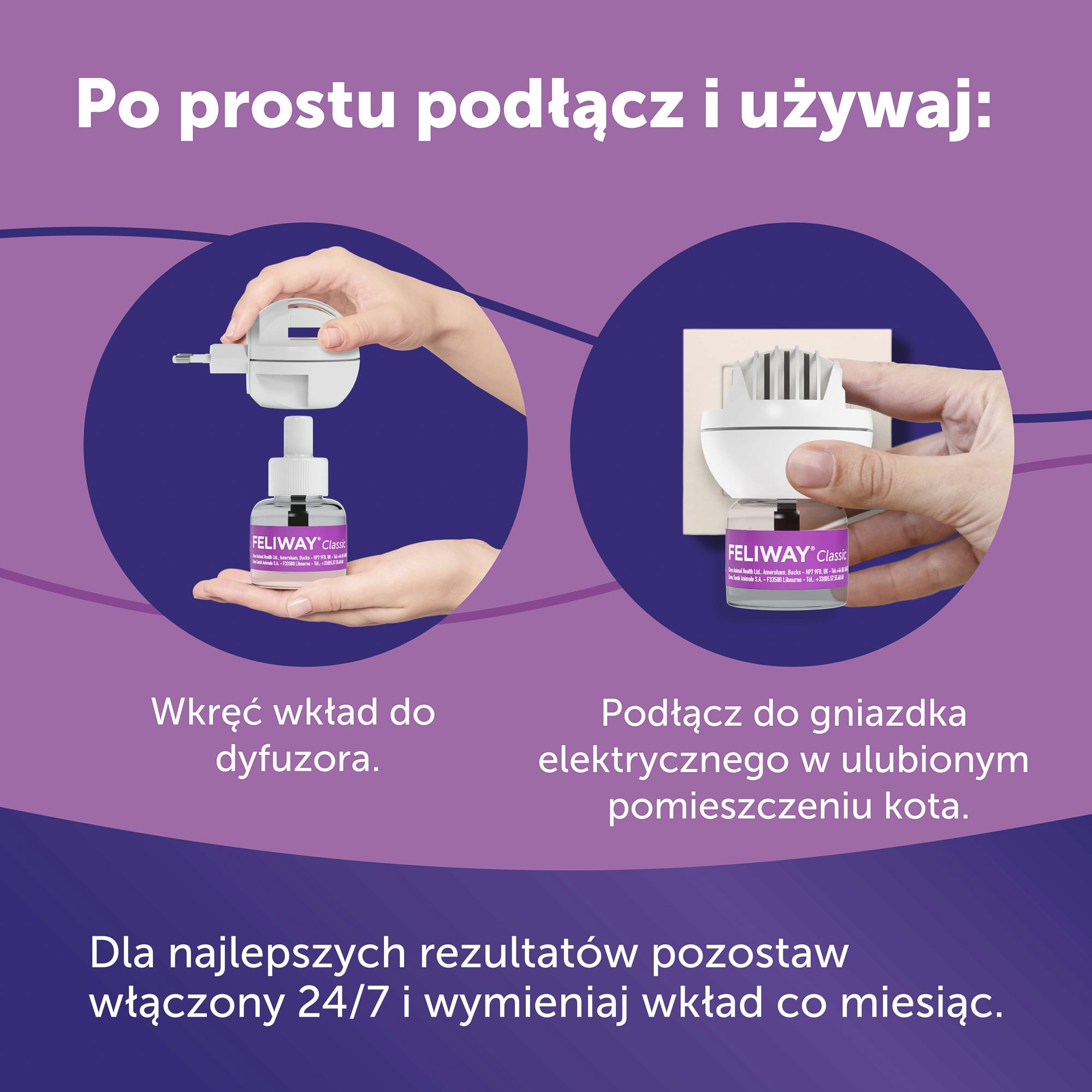 Dyfuzor jest niezwykle prosty w obsłudze i nie wymaga skomplikowanych procedur. Wystarczy wkręcić wkład do dyfuzora i podłączyć urządzenie do gniazdka w pomieszczeniu, w którym kot spędza najwięcej czasu. Produkt dostępny jest w dwóch wariantach – można wybrać kompletny zestaw dyfuzor z wkładem lub zakupić osobno zapasowy wkład uzupełniający. Po podłączeniu urządzenie rozpoczyna natychmiastowe uwalnianie feromonów uspokajających, które rozprzestrzeniają się w powietrzu, tworząc środowisko wolne od stresu. Dyfuzor działa bezgłośnie i nie wymaga dodatkowej obsługi podczas codziennego użytkowania.