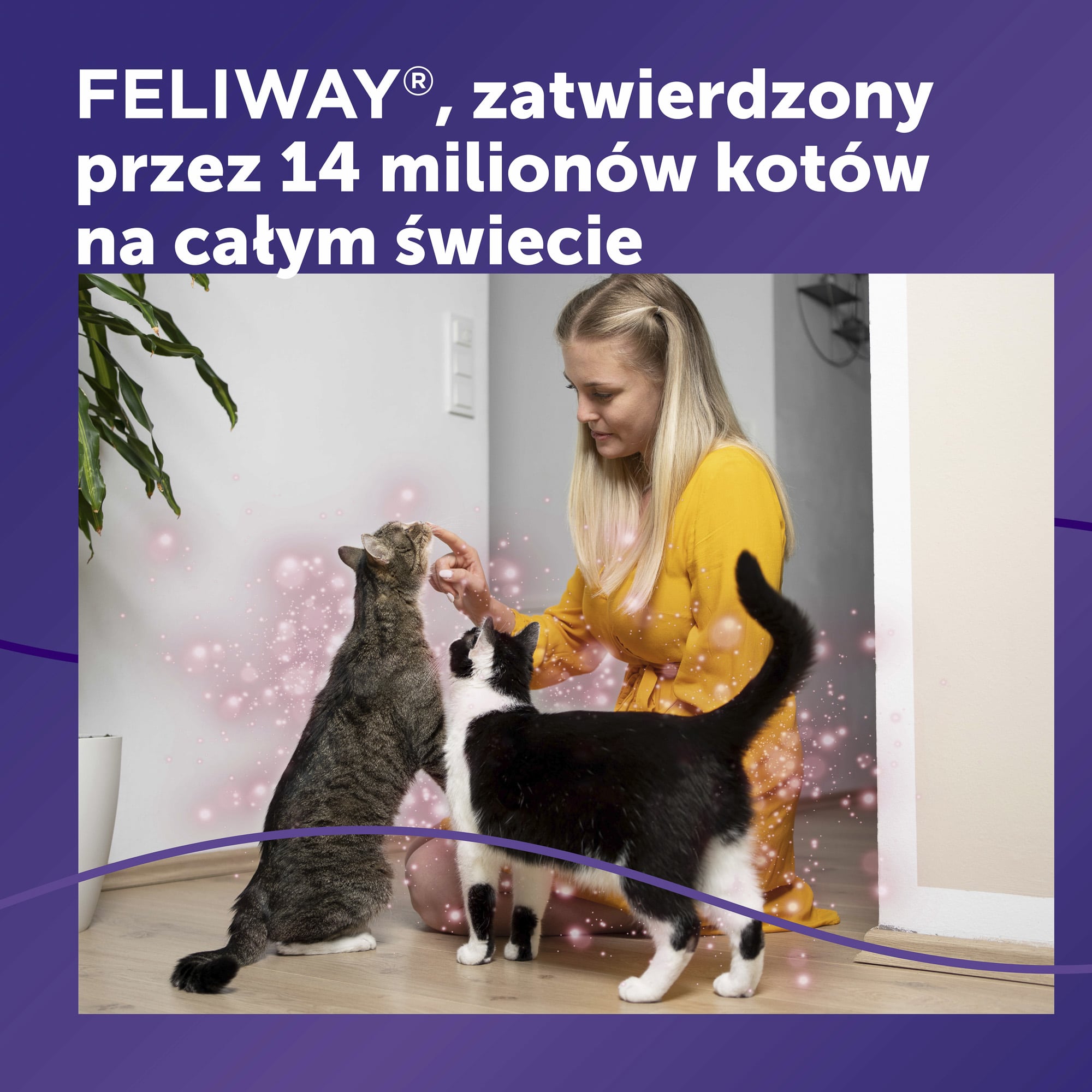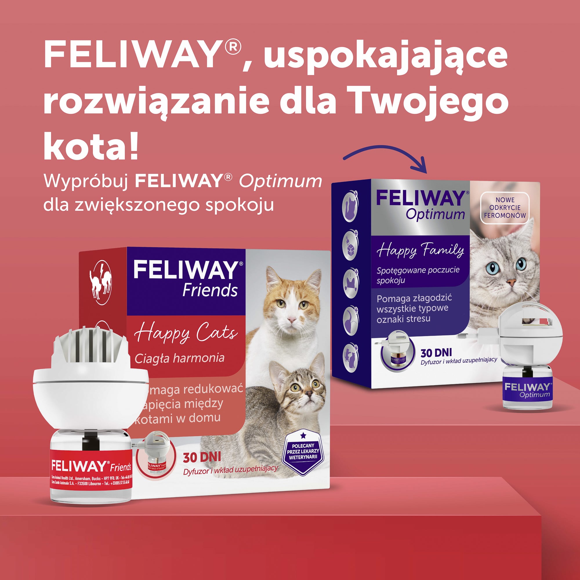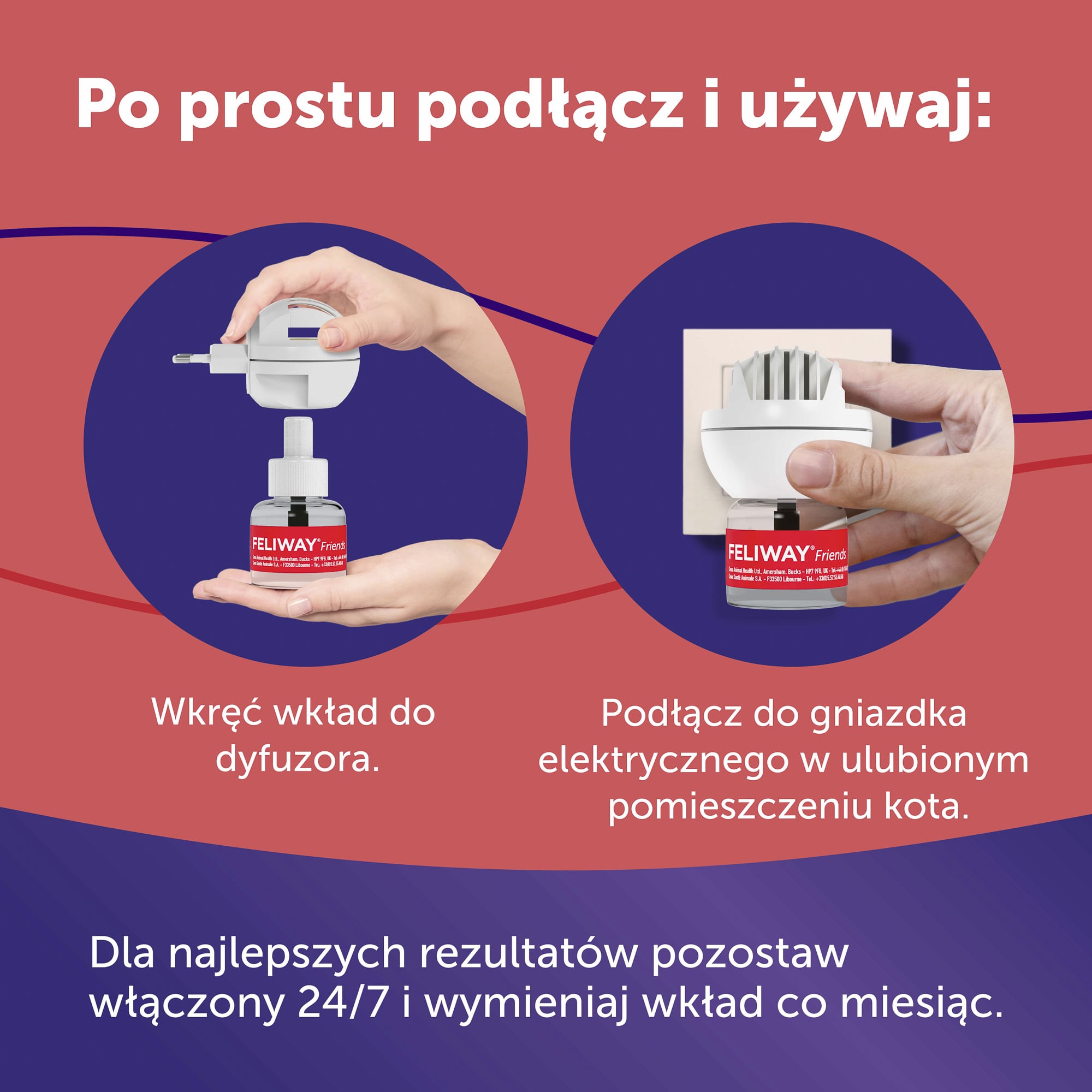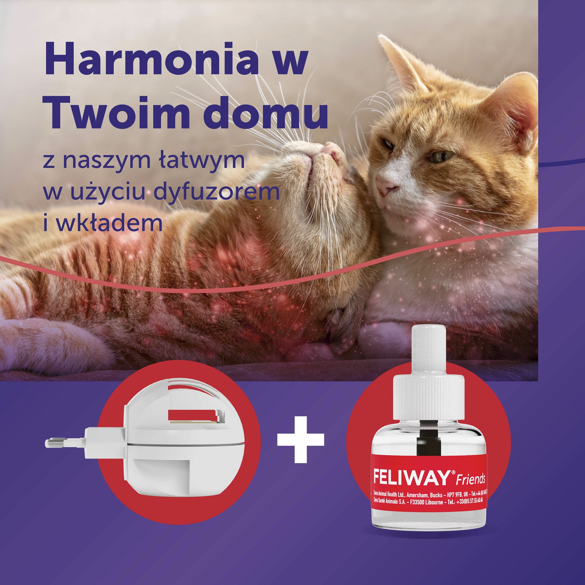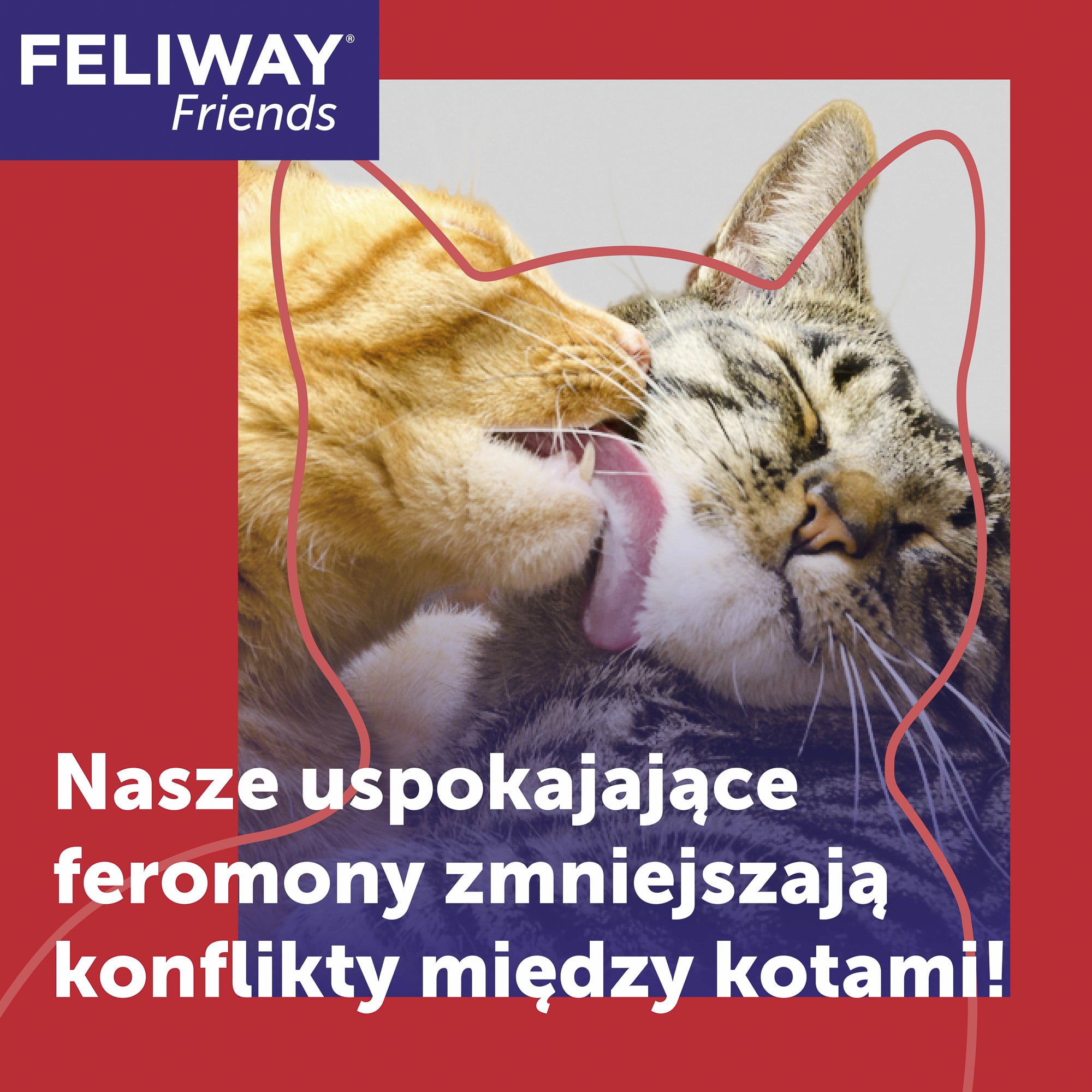 Jeśli Twoje koty walczą ze sobą albo się w siebie wpatrują to musisz mieć ten produkt. FELIWAY Friends zawiera syntetyczny odpowiednik kocich feromonów, który pozwala na wzmocnienie więzi u dorosłych kotów, mieszkających w jednym domu. Produkt ten pomaga kotom żyć w harmonii, unikać napięć i konfliktów. Stosuj w pomieszczeniu, w którym twoje koty spędzają najwięcej czasu lub w pomieszczeniu, w którym najczęściej dochodzi do konfliktów.