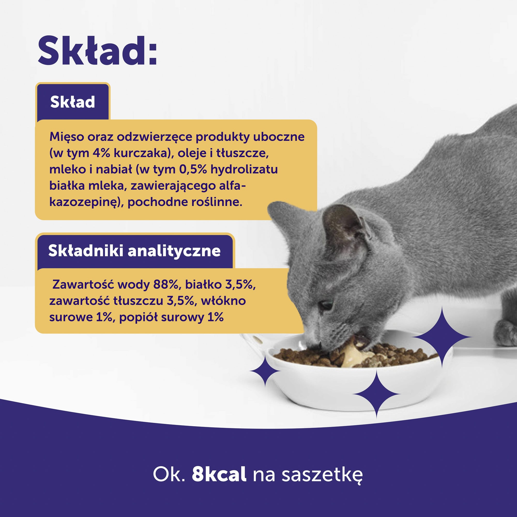 SKŁAD: mięso oraz odzwierzęce produkty uboczne (w tym 4% kurczaka), oleje i tłuszcze, mleko i nabiał (w tym 0,5% hydrolizatu białka mleka, zawierającego alfa-kazozepinę), pochodne roślinne.