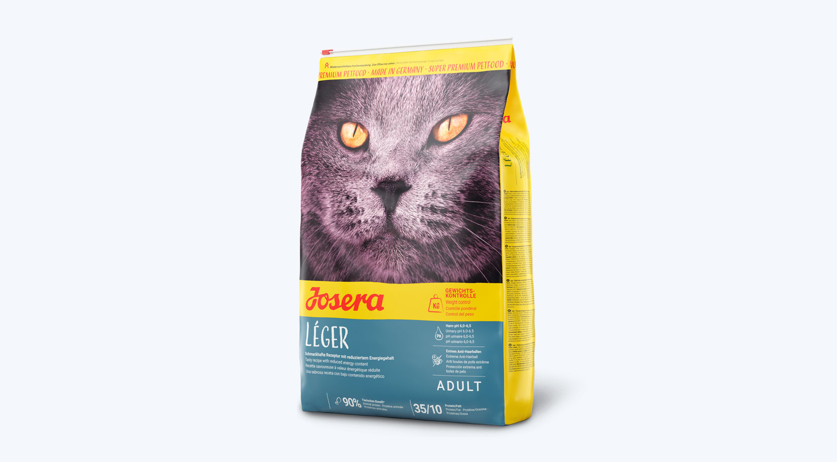 Idealna dla kotów o obniżonej aktywności, z tendencją do nadwagi oraz dla kotów wymagających lekkiego zrzucenia wagi np. po zabiegu kastracji lub sterylizacji. Receptura z wysoką zawartością białka, która pobudza przemianę materii, a L-karnityna wspomaga metabolizm tłuszczów. Ze względu na zwiększoną ilość włókna dietetycznego, karma sprawia uczucie sytości u kota. Powoduje również zmniejszenie powstawania kul włosowych. Starannie dobrane składniki zapewniają optymalny stosunek wapnia do fosforu oraz obniżony poziom magnezu, dlatego karma Josera Catelux pozwala utrzymywać pH moczu na poziomie 6-6,5 co ogranicza pojawianiu się kamicy. Cenne kwasy tłuszczowe zawarte w karmie, oraz witaminy, a także cynk i miedź pozytywnie wpływają na skórę i sierść. Karma wyprodukowana zgodnie z normą jakości DLG.