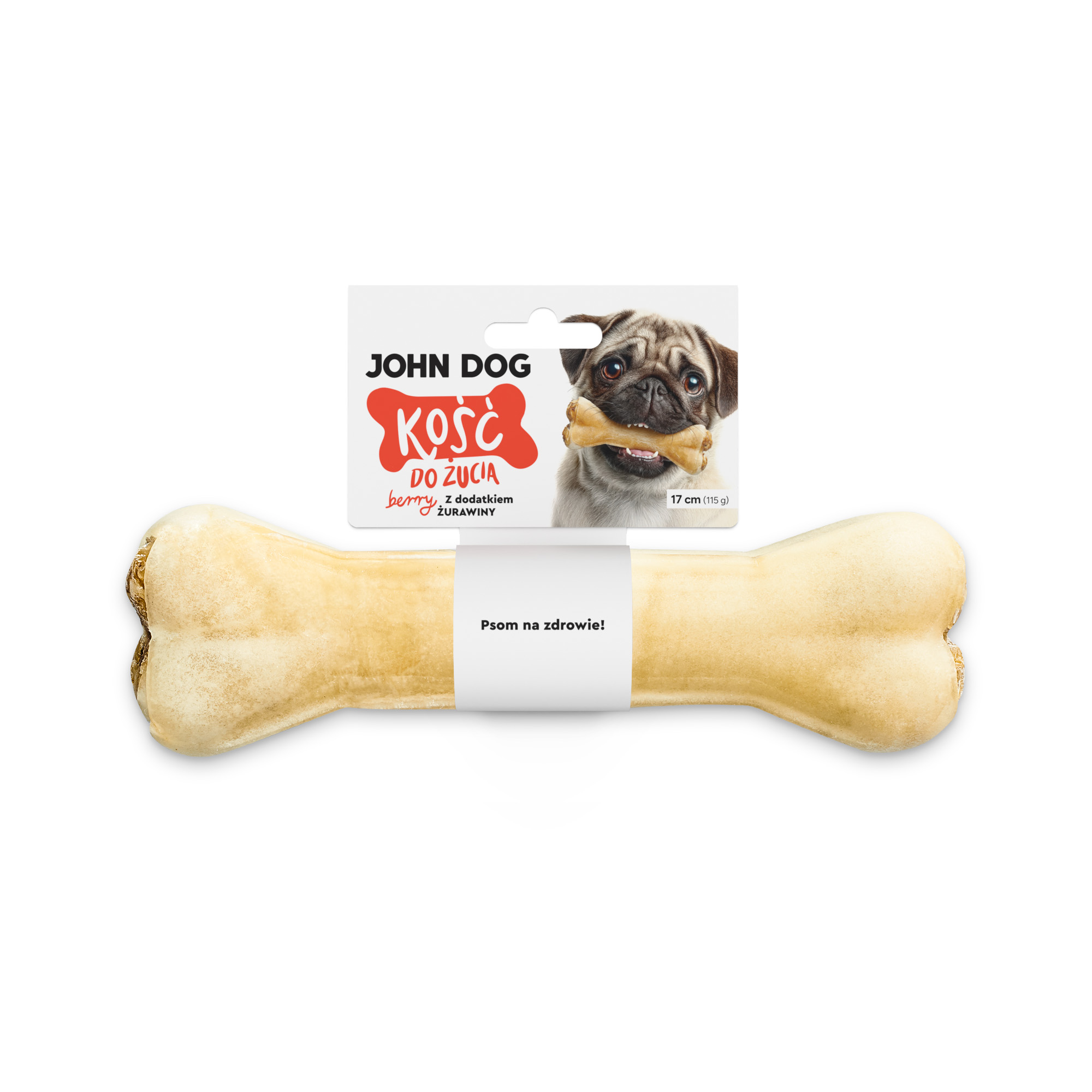 Regularne żucie zaspokaja naturalny instynkt czworonoga, co przekłada się na redukcję stresu i znudzenia. Struktura kości wymaga od psa koncentracji i wysiłku, co pozytywnie stymuluje jego aktywność umysłową i zapewnia długotrwałe, satysfakcjonujące zajęcie. Intensywne żucie naturalnie wspiera higienę jamy ustnej, pomagając w usuwaniu miękkiego osadu nazębnego i masowaniu dziąseł. Wysoka zawartość białka pochodzenia zwierzęcego dostarcza organizmowi psa niezbędnych aminokwasów wspierających rozwój mięśni i utrzymanie prawidłowej kondycji fizycznej. Naturalne dodatki — żurawina, siemię lniane, rokitnik i żeń-szeń – wzbogacają dietę psa o cenne witaminy, antyoksydanty i mikroelementy oraz sprawiają, że kość jest wyjątkowo smakowita.