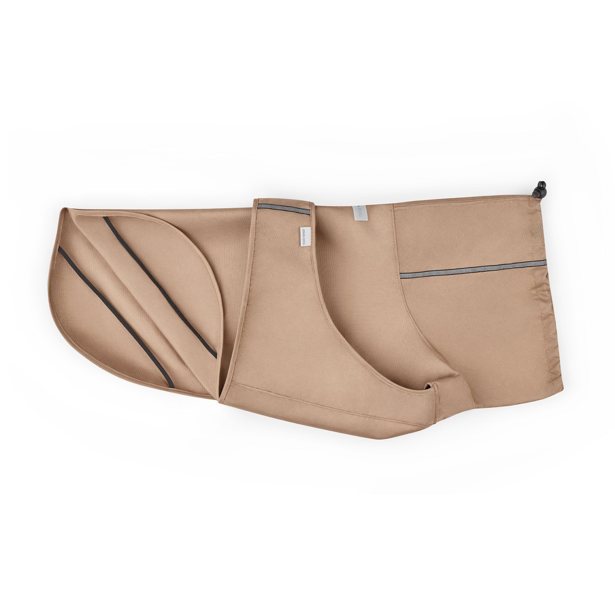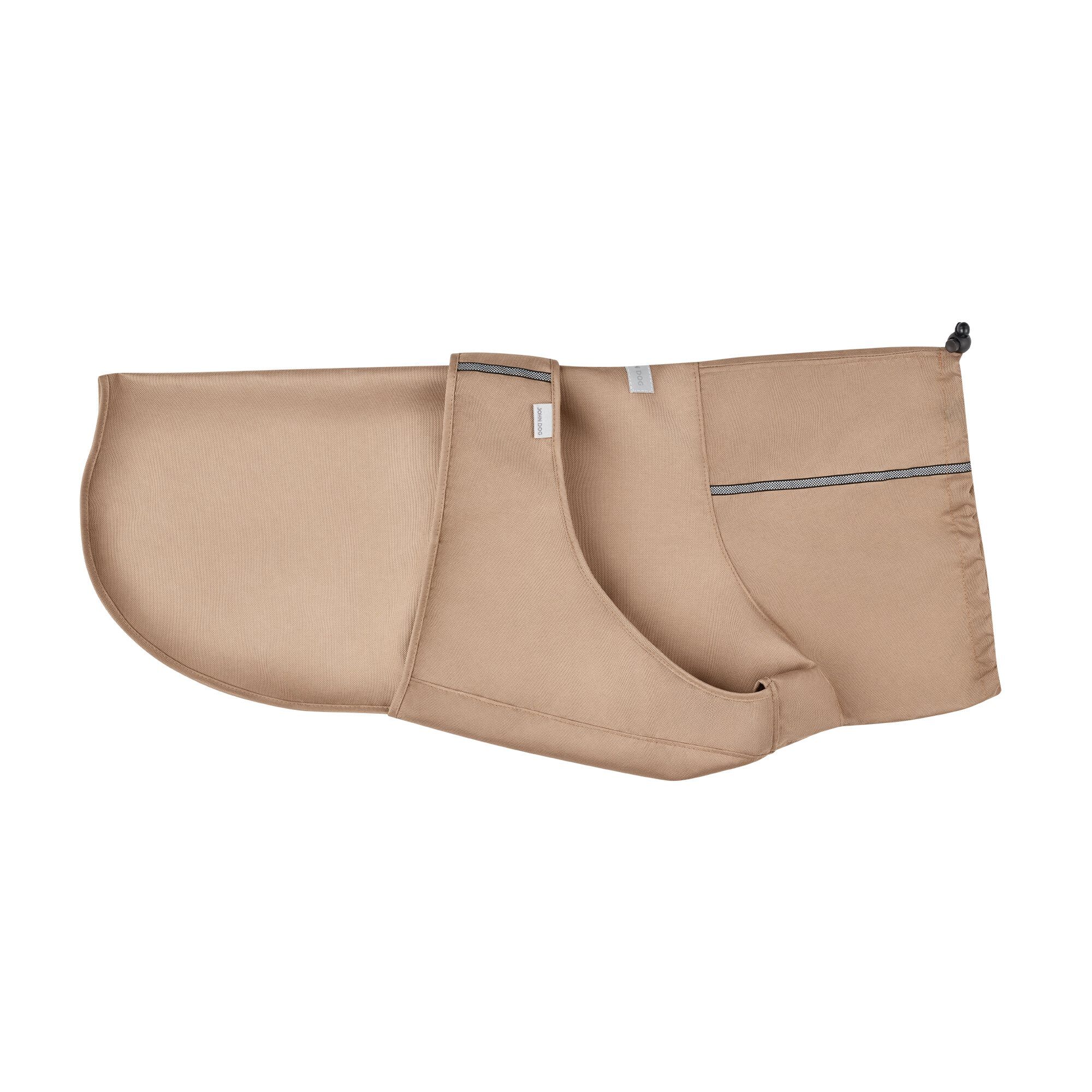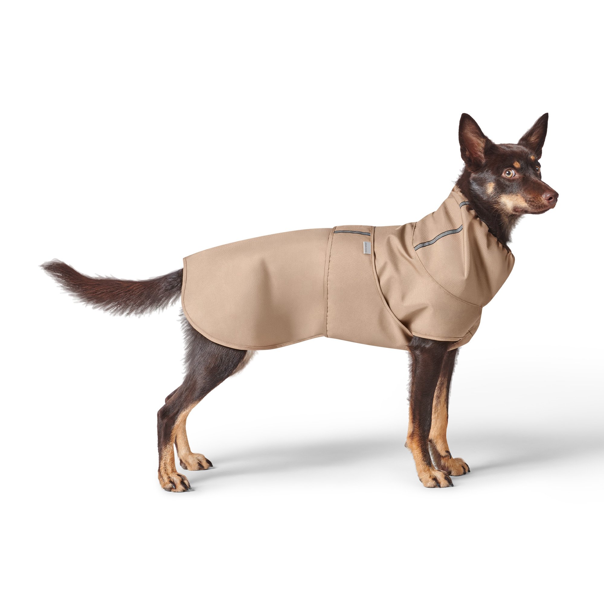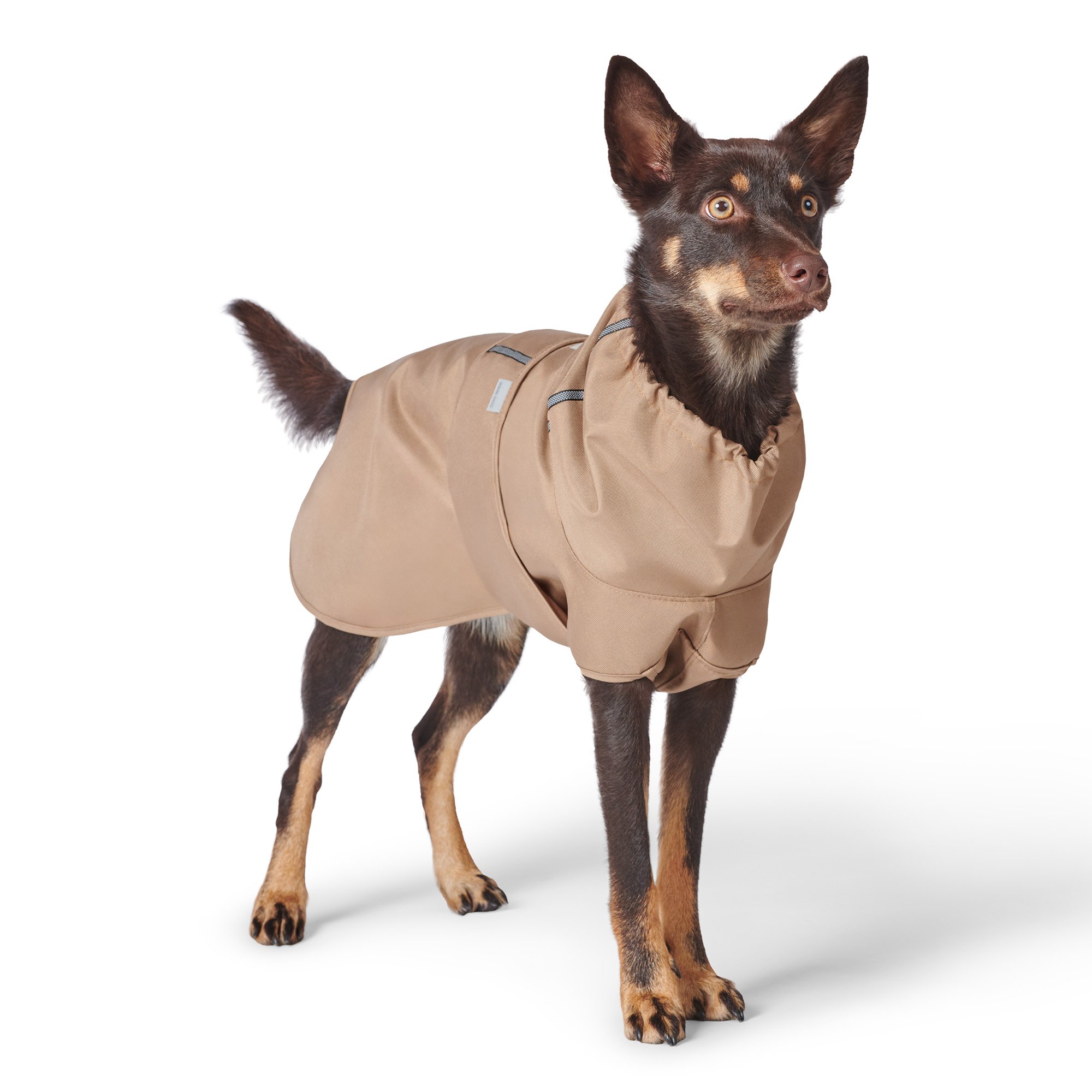Kurtka przeciwdeszczowa dla psa dostępna jest w ośmiu rozmiarach, co pozwala na precyzyjne dopasowanie do wielkości pupila. Kluczowym elementem dopasowania jest regulowany obwód klatki piersiowej za pomocą paska z odblaskiem zapinanego na rzep, który umożliwia dostosowanie kurtki do indywidualnej budowy ciała psa. Wysokość golfa można regulować za pomocą gumki ze stoperem, co pozwala na dopasowanie kołnierza do obwodu szyi psa. Golf można również wywinąć, skracając jego wysokość w zależności od preferencji i budowy zwierzęcia. Stabilizujące gumki na tylne łapy zapobiegają przesuwaniu się kurtki podczas aktywnego spaceru, nawet podczas przemierzania miejskiej dżungli lub leśnych bezdroży. Produkt jest szczególnie polecany dla psów średnich i dużych ras, takich jak lagotto romagnolo, bulterier, labrador, golden retriever, border collie czy wyżeł.