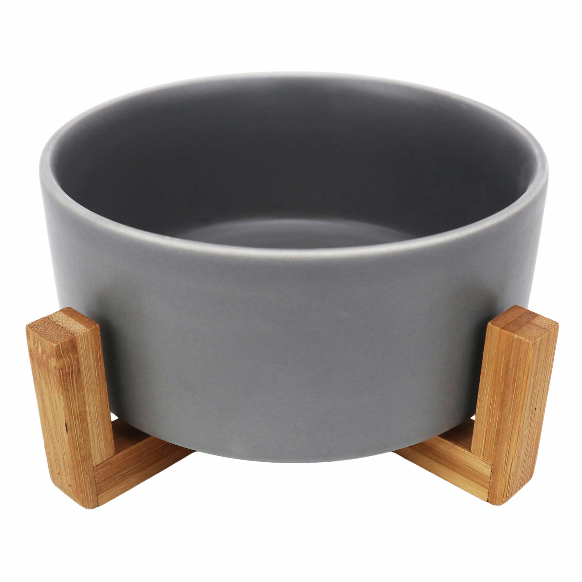Miska z drewnianym stojakiem, który stabilizuje pozycję talerzyka oraz pozwala na przyjęcie nieco wyższej pozycji podczas posiłku. Miska wykonana jest z ceramiki. Ma elegancki szary kolor, pasujący do większości wnętrz. Ze względu na ciężar naczynia i umiejscowienie na podstawce, zwierzętom trudniej będzie przesuwać ją po podłodze. To dodatkowo minimalizuje ryzyko jej przewrócenia.