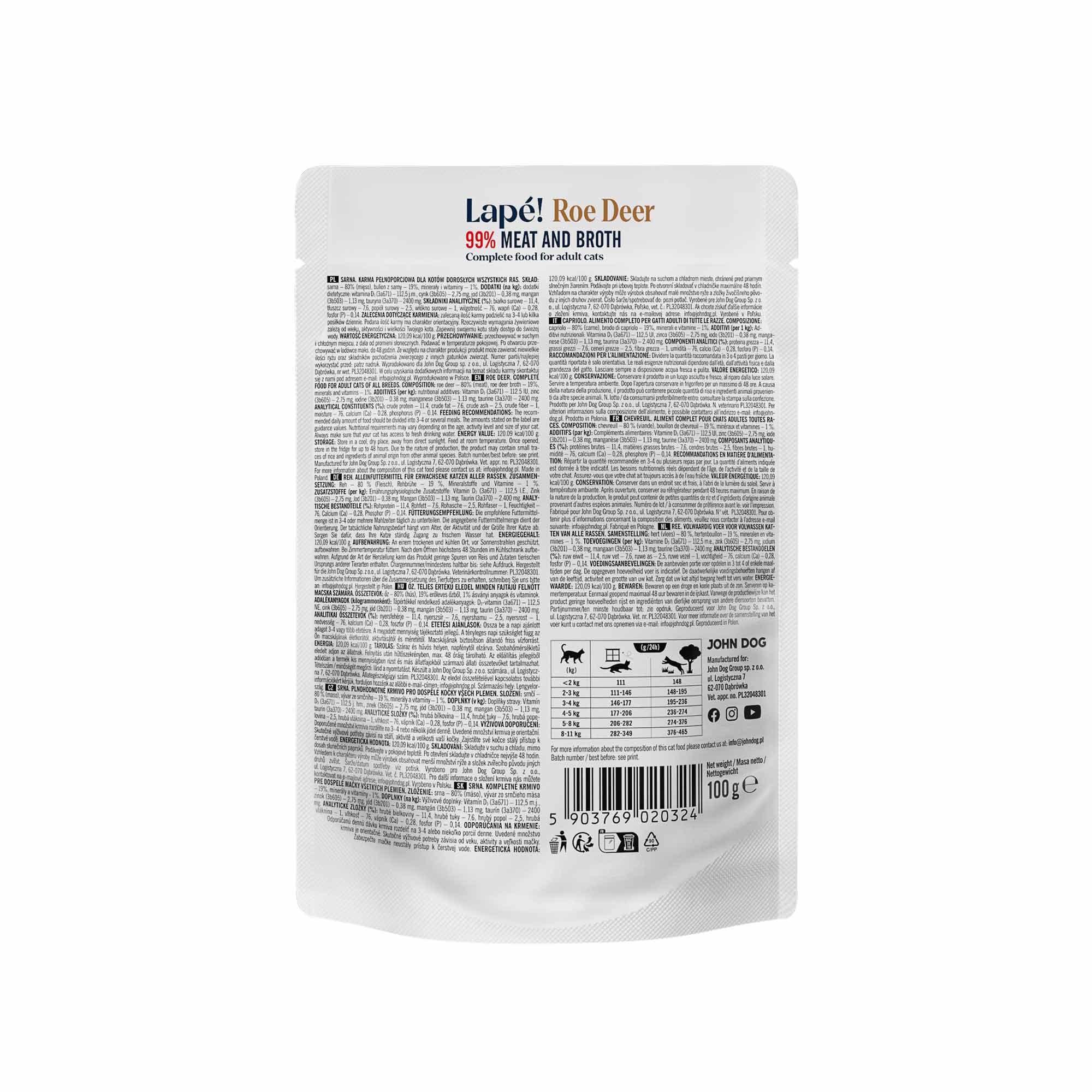 Marka John Dog for Cats specjalizuje się w produkcji wysokiej jakość karm i przysmaków dla kotów. Lapé to linia monobiałkowych i bezzbożowych karm mokrych dla kotów ze starannie wyselekcjonowanych mięs o wysokiej smakowitości. Filozofia marki opiera się na przekonaniu, że koty zasługują na posiłek odpowiadający ich naturalnym potrzebom żywieniowym, dlatego każda saszetka zawiera aż 99% mięsa i rosołu z dominującym udziałem mięsa mięśniowego o wysokiej wartości odżywczej. Produkty z tej linii zapewniają pełnoporcjowy i odpowiednio zbilansowany posiłek dla najbardziej wymagających kotów.