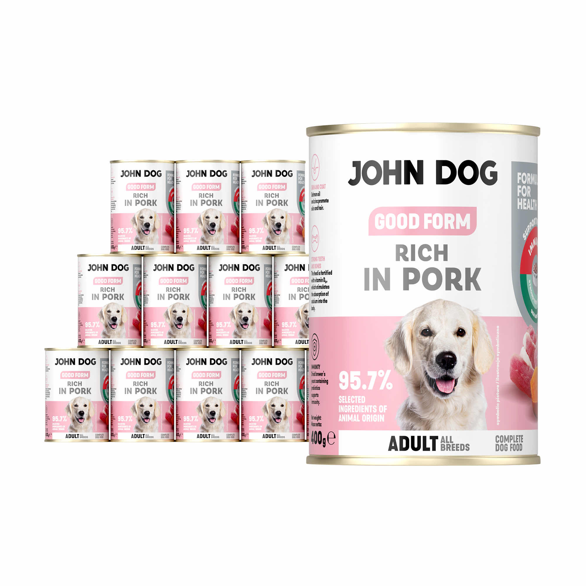 John Dog Good Form rich in pork została opracowana dla psów dorosłych wszystkich ras. Wysokomięsna receptura zapewnia wysoką smakowitość. Monobiałkowa formuła sprawdzi się u psów z alergią pokarmową lub wymagających diety eliminacyjnej. Dzięki jednorodnej konsystencji mokrej karmy, produkt może być atrakcyjny dla wybrednych psów, które docenią naturalny aromat składników mięsnych.