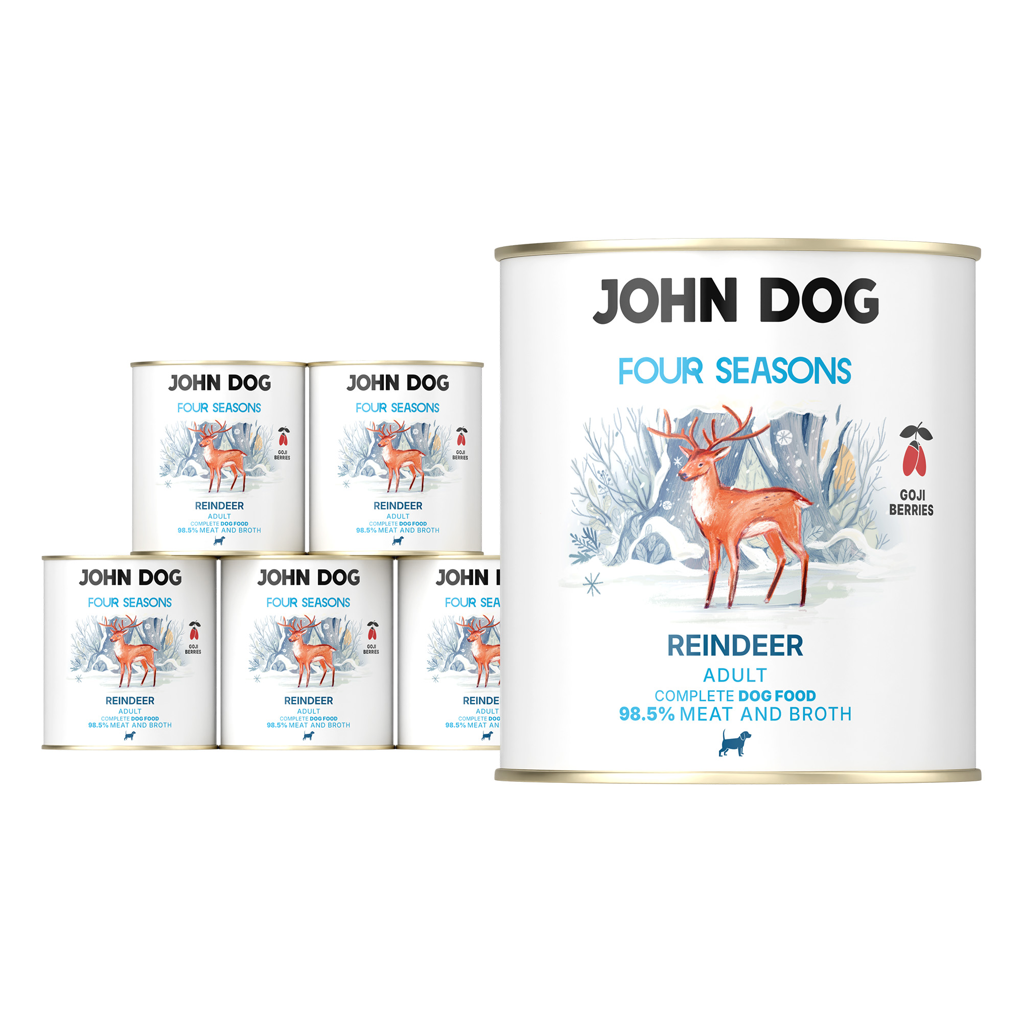 Karma mokra John Dog Four Seasons Renifer to pełnoporcjowa, wysokomięsna i hipoalergiczna karma dla psów dorosłych, inspirowana porami roku oraz wzbogacona o ciekawe składniki naturalne. Karma zawiera aż 98,5% mięsa i rosołu z renifera, w tym 70% mięsa mięśniowego, które jest źródłem wartościowego białka. Dzięki prostemu składowi bez zbóż i drobiu znacznie zmniejsza ryzyko wystąpienia reakcji alergicznych. Monoproteinowa formuła sprawdzi się także dla psów wymagających diety eliminacyjnej. Karma została wzbogacona jagodami goi, które naturalnie wspierają ogólny stan zdrowia i dostarczają cennych przeciwutleniaczy, witamin i minerałów, mając pozytywny wpływ na układ odpornościowy, trawienny i krążenia.