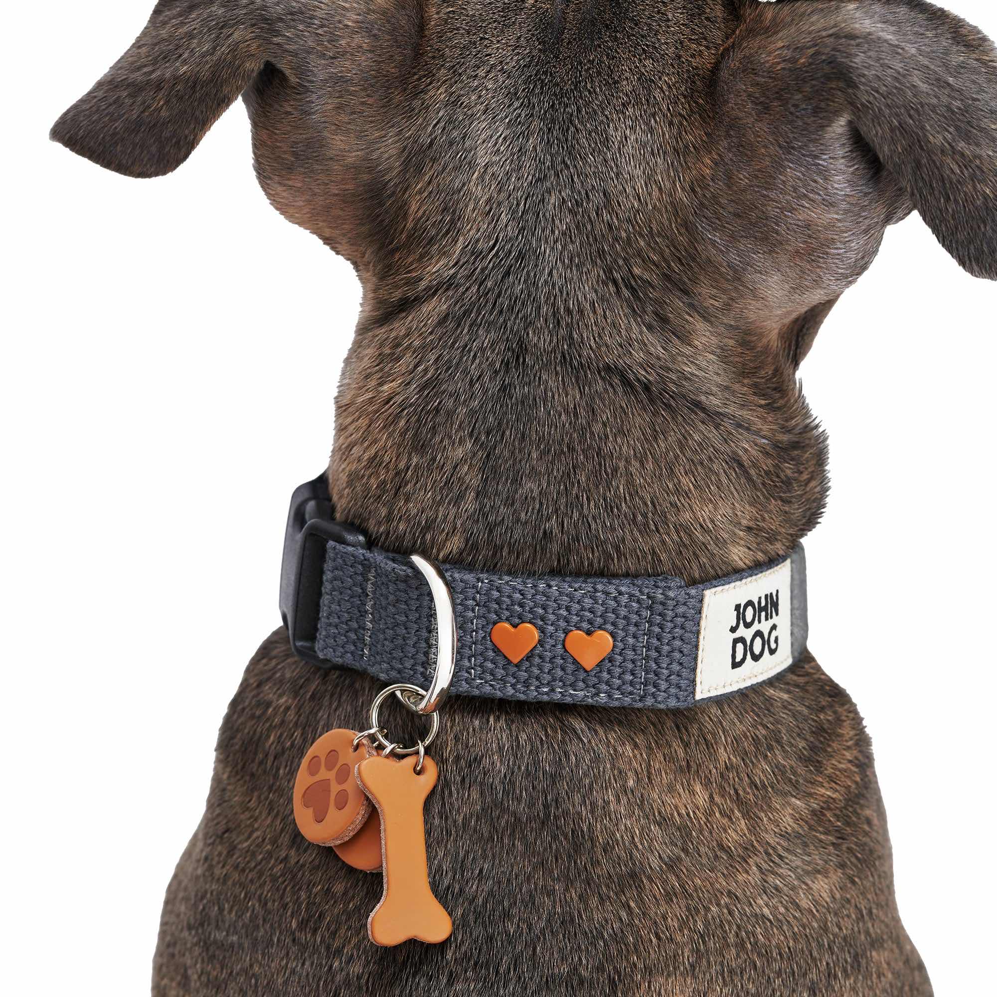 Obroża w stylowym, grafitowym kolorze. Solidnie wykonana. Dostępna jest w 3 rozmiarach. Dzięki regulowanemu obwodowi z łatwością dopasuje się do wymiarów psa. Wykonana z bawełny, dzięki czemu zapewnia komfort użytkowania. Zapinana na klamrę. Ze skórzaną zawieszką symbolizującą bezwarunkową miłość do ukochanych czworonogów.