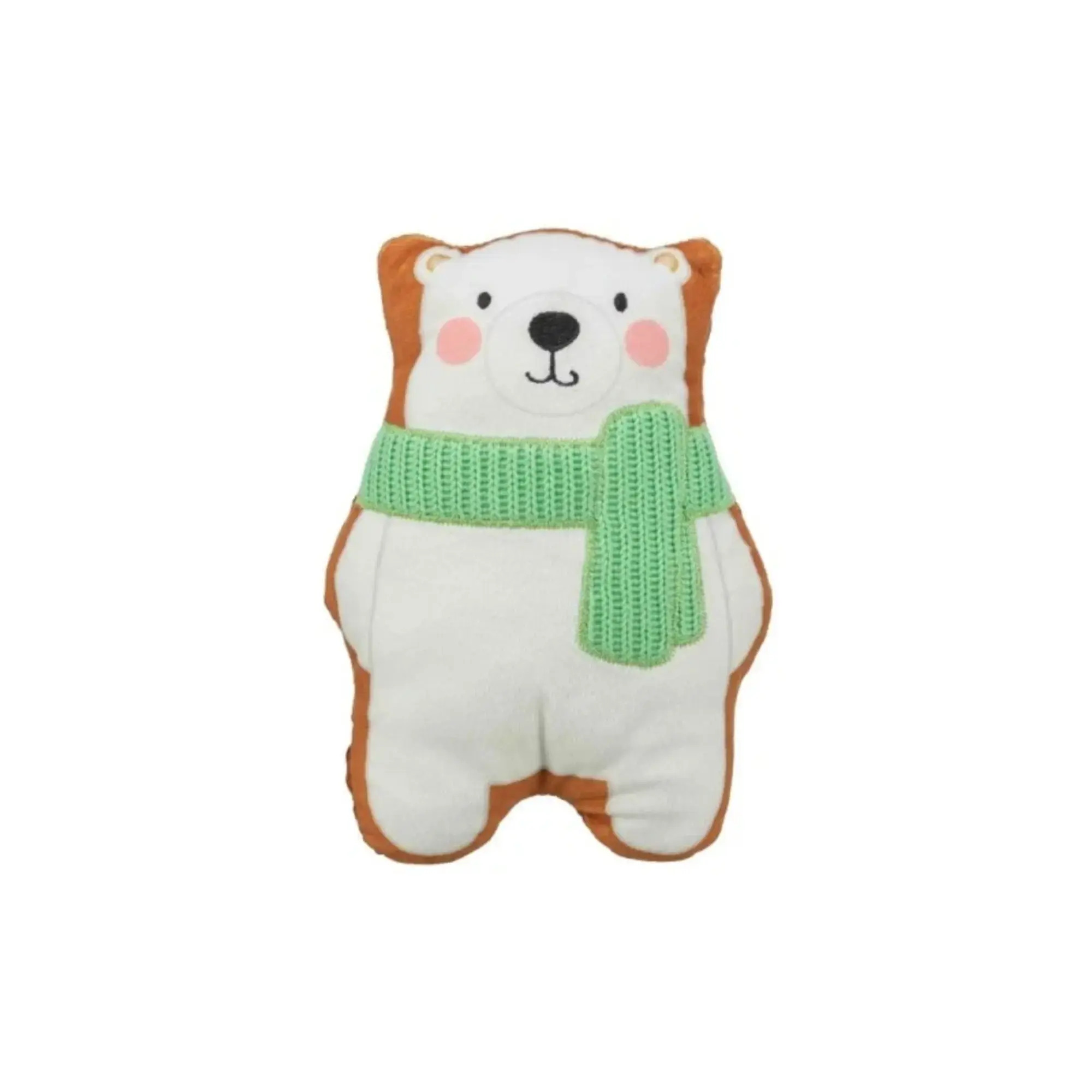 Miękki i przyjemny w dotyku miś polarny. Zabawka pluszowa w kształcie misia polarnego, ubrana w zielony, dzianinowy szalik, z przyjaznym wyrazem twarzy i rumianymi policzkami.
