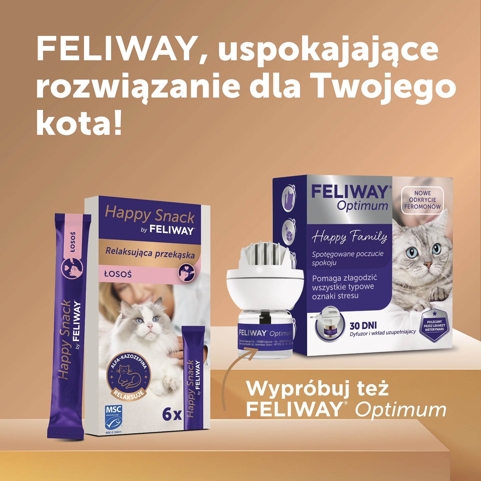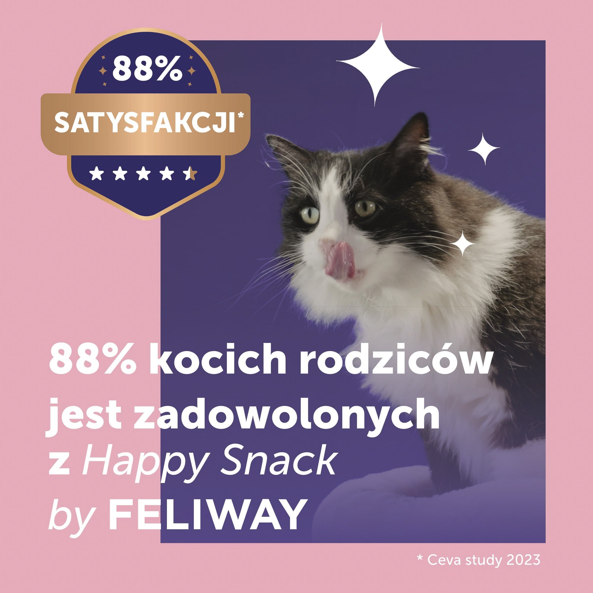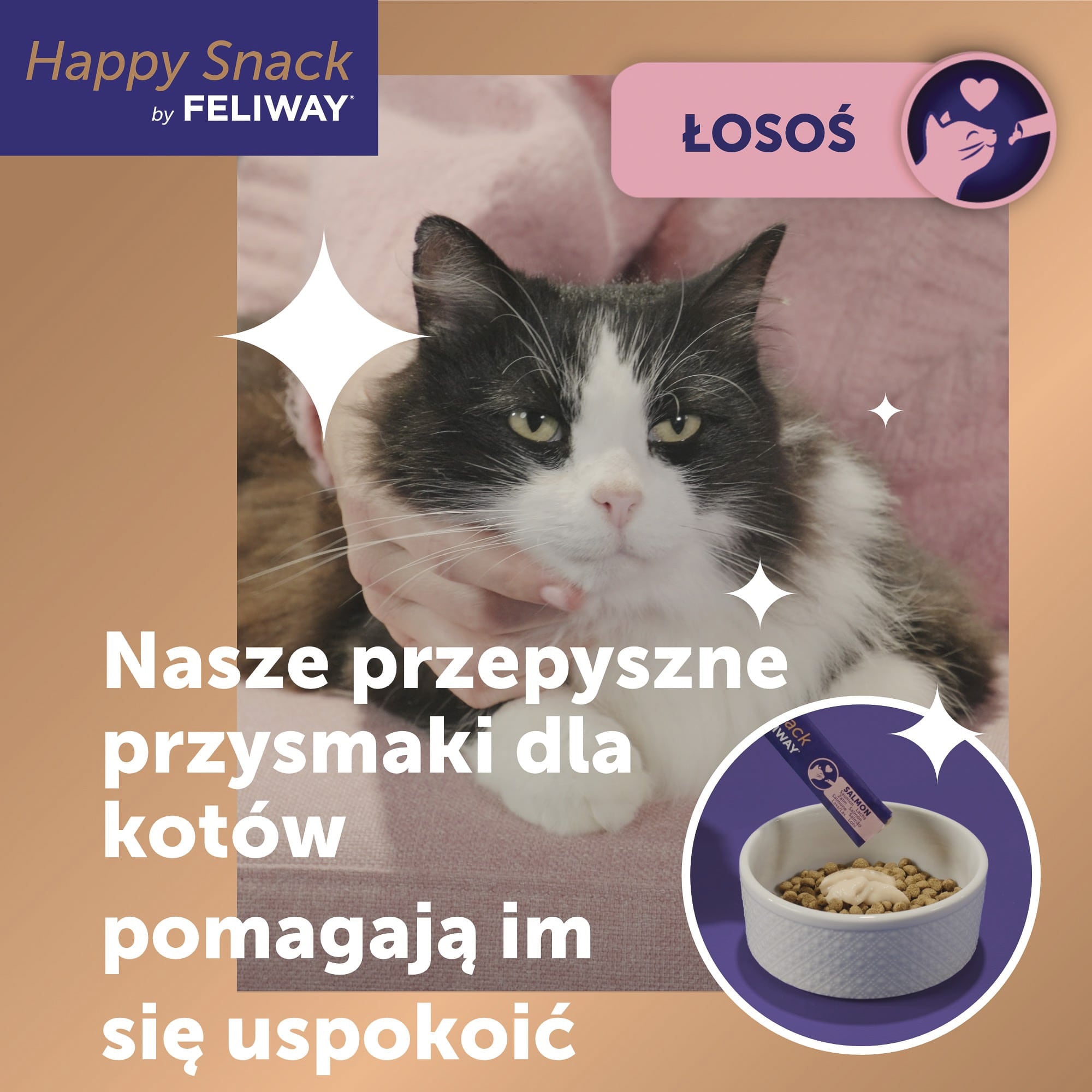 Happy Snack by FELIWAY to innowacyjna relaksująca kremowa przekąska dla kotów i kociąt od 12 tygodnia życia, dostępna w praktycznym opakowaniu 6 saszetek po 15g każda. Smakołyk o intensywnym smaku łososia w formie nadającej się do lizania pasty zawiera certyfikowanego łososia MSC oraz alfa-kazozepinę – naturalne białko mleka znane z właściwości uspokajających. To nisko kaloryczna przekąska bez konserwantów, sztucznych barwników, dodatku cukru i glutenu, którą można bezpiecznie podawać codziennie.