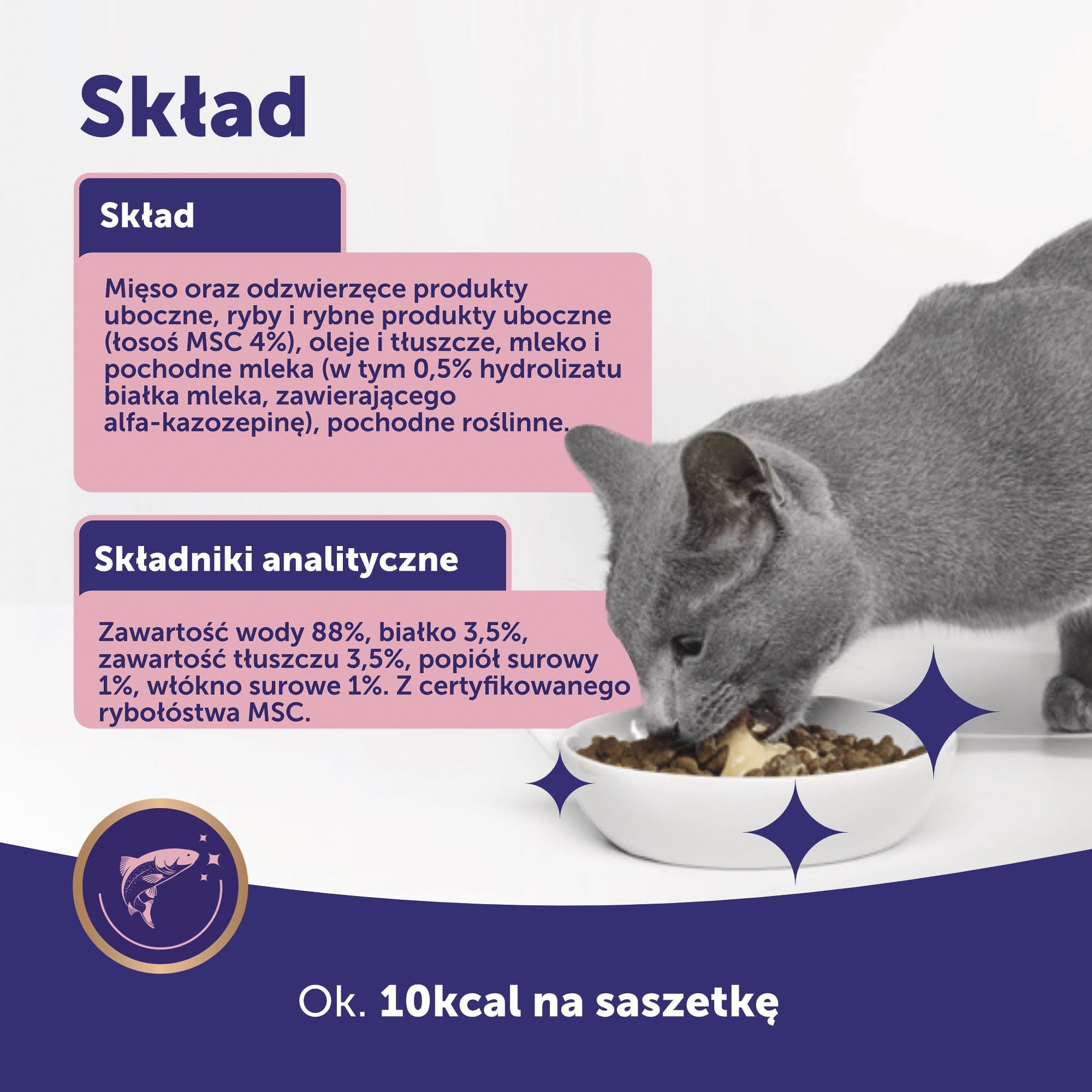 mięso oraz odzwierzęce produkty uboczne, ryby i rybne produkty uboczne (łosoś MSC* 4%), oleje i tłuszcze, mleko i pochodne mleka (w tym 0,5% hydrolizatu białka mleka, zawierającego alfa-kazozepinę), pochodne roślinne. *Z certyfikowanego MSC.