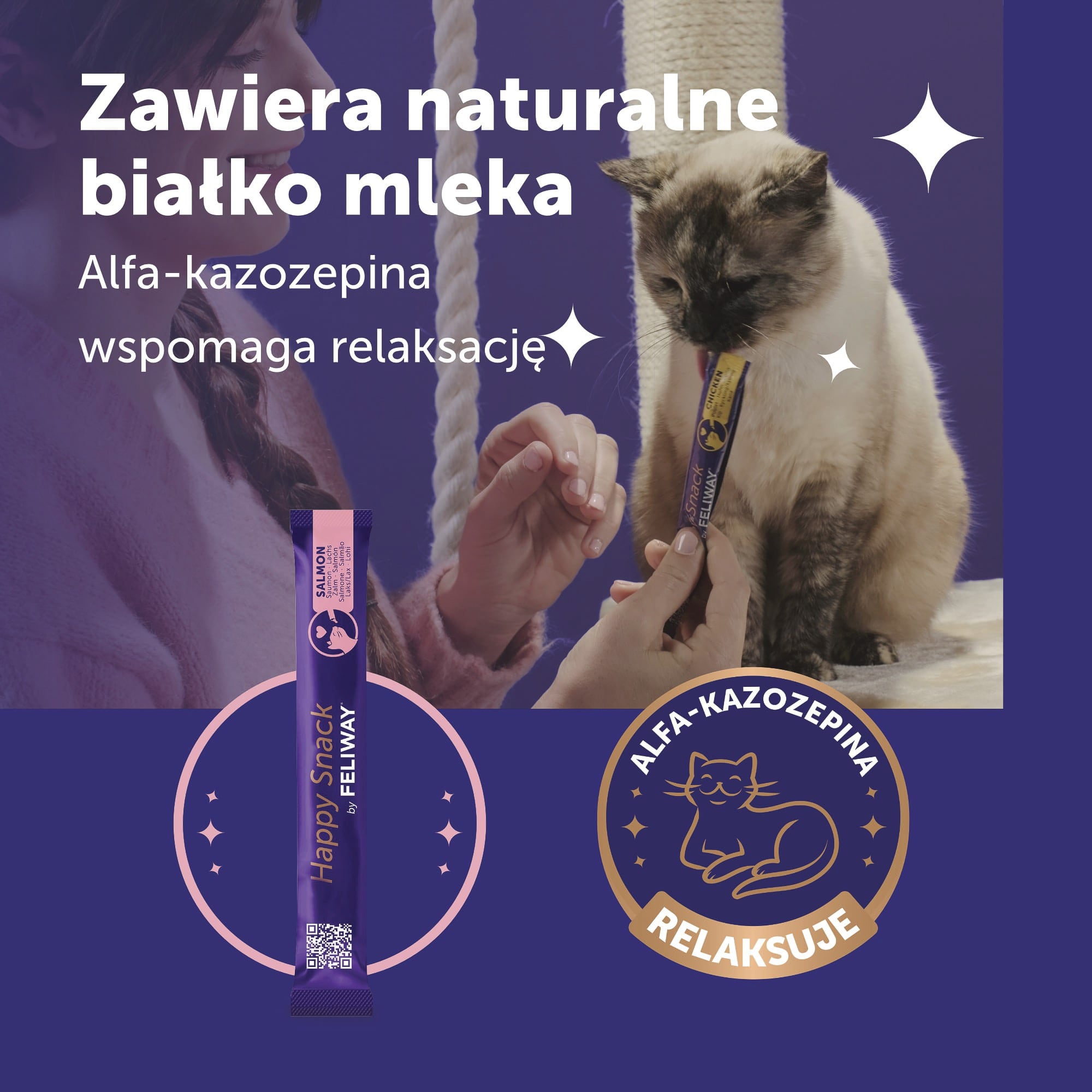 Alfa-kazozepina to naturalne białko mleka, które skutecznie wspiera układ nerwowy kota, pomagając mu radzić sobie ze stresem i niepokojem w trudnych sytuacjach. Happy Snack z łososiem działa łagodząco podczas nieoczekiwanych lub nietypowych wydarzeń, takich jak wizyty weterynaryjne, podróże, zmiana otoczenia czy inne stresujące okoliczności. Dzięki tej unikalnej formule przekąska pomaga zachować spokój i równowagę emocjonalną zwierzęcia, wspierając jego ogólne samopoczucie. Jest to lekka przekąska, którą pokochają wszystkie koty.