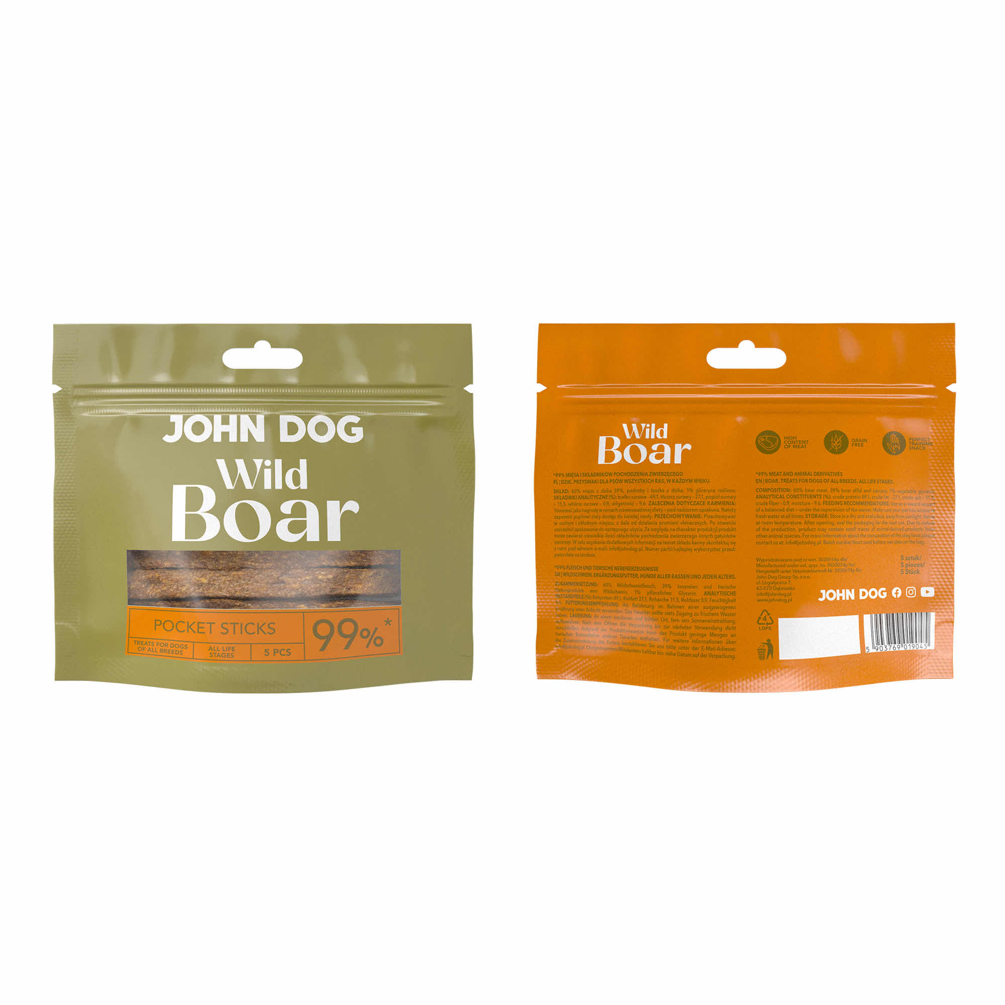 Hipoalergiczne, bezglutenowe przysmaki dla psa John Dog Wild Pocket Sticks Dzik to idealne smakołyki treningowe dla psów wszystkich ras w każdym wieku. Aż 99% dzika bez dodatku zbóż, sztucznych barwników i sztucznych konserwantów sprawia, że smaczki są doskonałą i bezpieczną nagrodą podczas treningu. Wygodne opakowanie zawierające 5 sztuk twardych sticksów idealnie mieści się w kieszeni. Dzięki temu stanowią niezastąpioną nagrodę podczas spacerów, profesjonalnego treningu czy domowej nauki nowych komend.