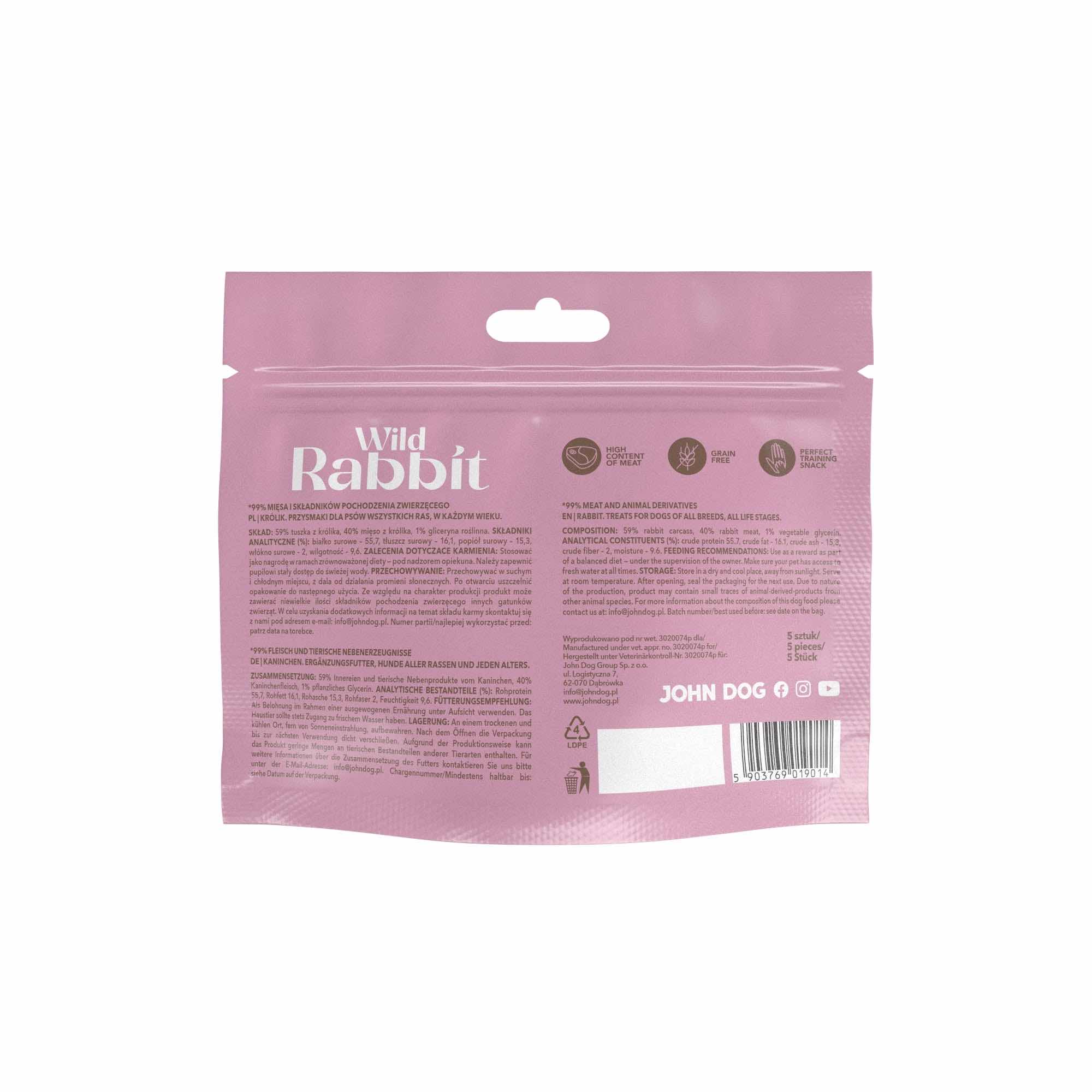 Wyjątkowa jakość tego przysmaku dla psa wynika z jego wysokomięsnego składu – 99% królika bez zbóż i sztucznych dodatków. Ten monobiałkowy przysmak dla psa oparty na jednym rodzaju mięsa sprawia, że przekąska świetnie sprawdzi się u psów z alergią pokarmową na wybrane rodzaje białka. Wysokie wartości odżywcze zapewniają psu energię i wsparcie dla prawidłowego rozwoju. Dzięki „dzikiemu” smakowi królika i naturalnym składnikom, John Dog Wild Pocket Sticks to gwarancja smakowitej nagrody dla każdego czworonoga.