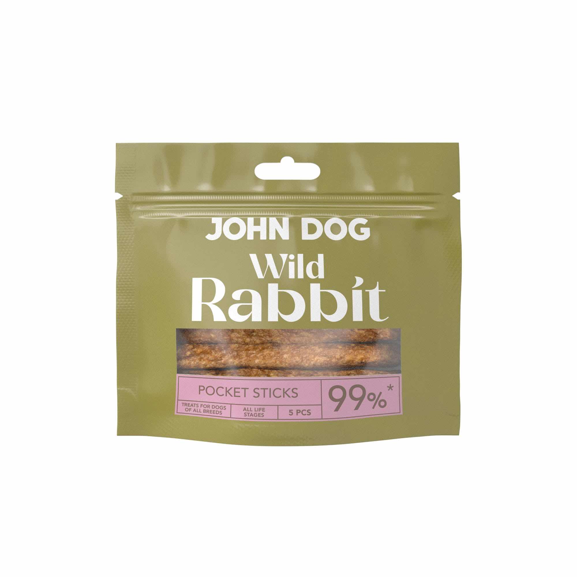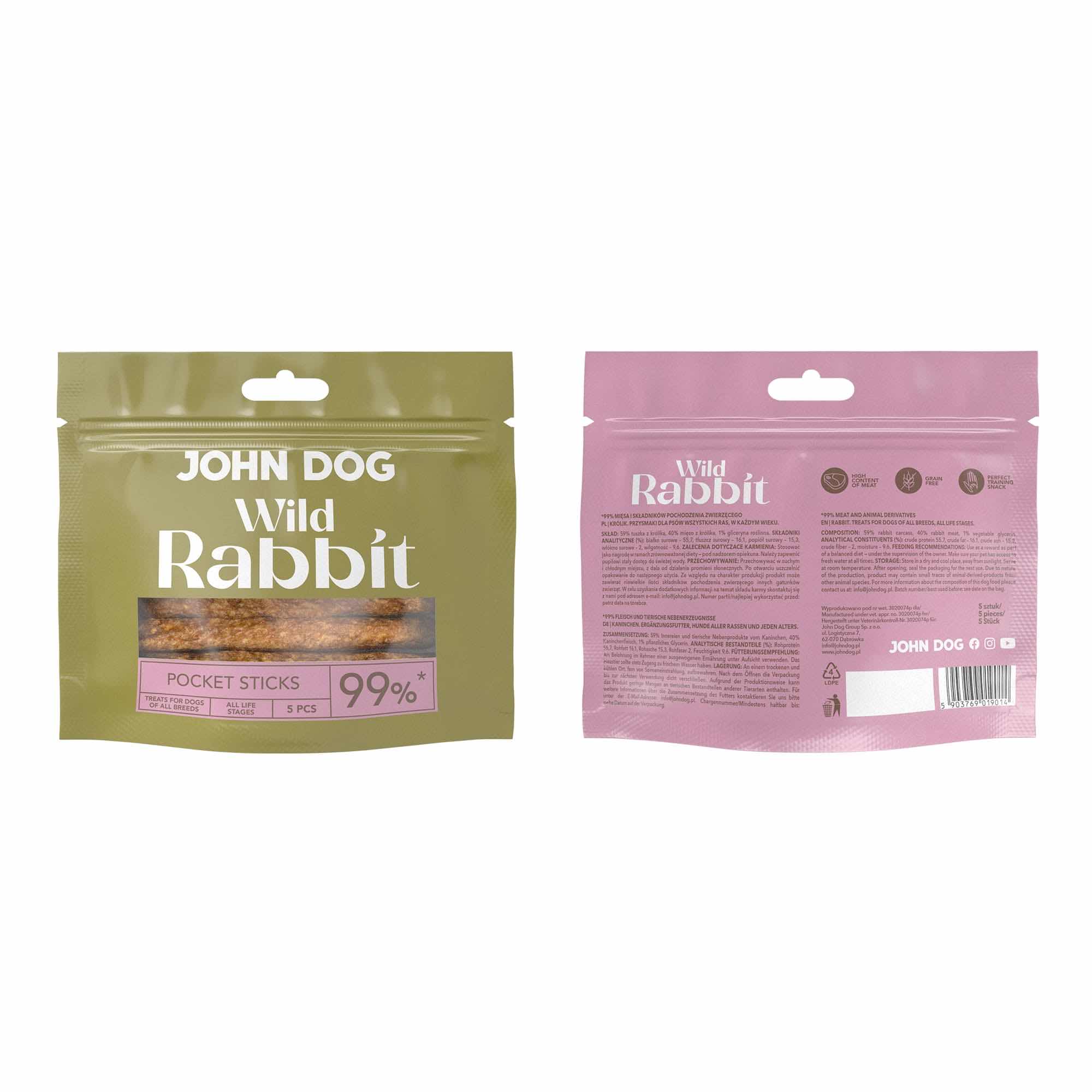 Hipoalergiczne, bezglutenowe przysmaki dla psa John Dog Wild Pocket Sticks Królik to idealne smakołyki treningowe dla psów wszystkich ras w każdym wieku. Aż 99% królika bez dodatku zbóż, sztucznych barwników i sztucznych konserwantów sprawia, że smaczki są doskonałą i bezpieczną nagrodą podczas treningu. Wygodne opakowanie zawierające 5 sztuk twardych sticksów idealnie mieści się w kieszeni. Dzięki temu stanowią niezastąpioną nagrodę podczas spacerów, profesjonalnego treningu czy domowej nauki nowych komend.