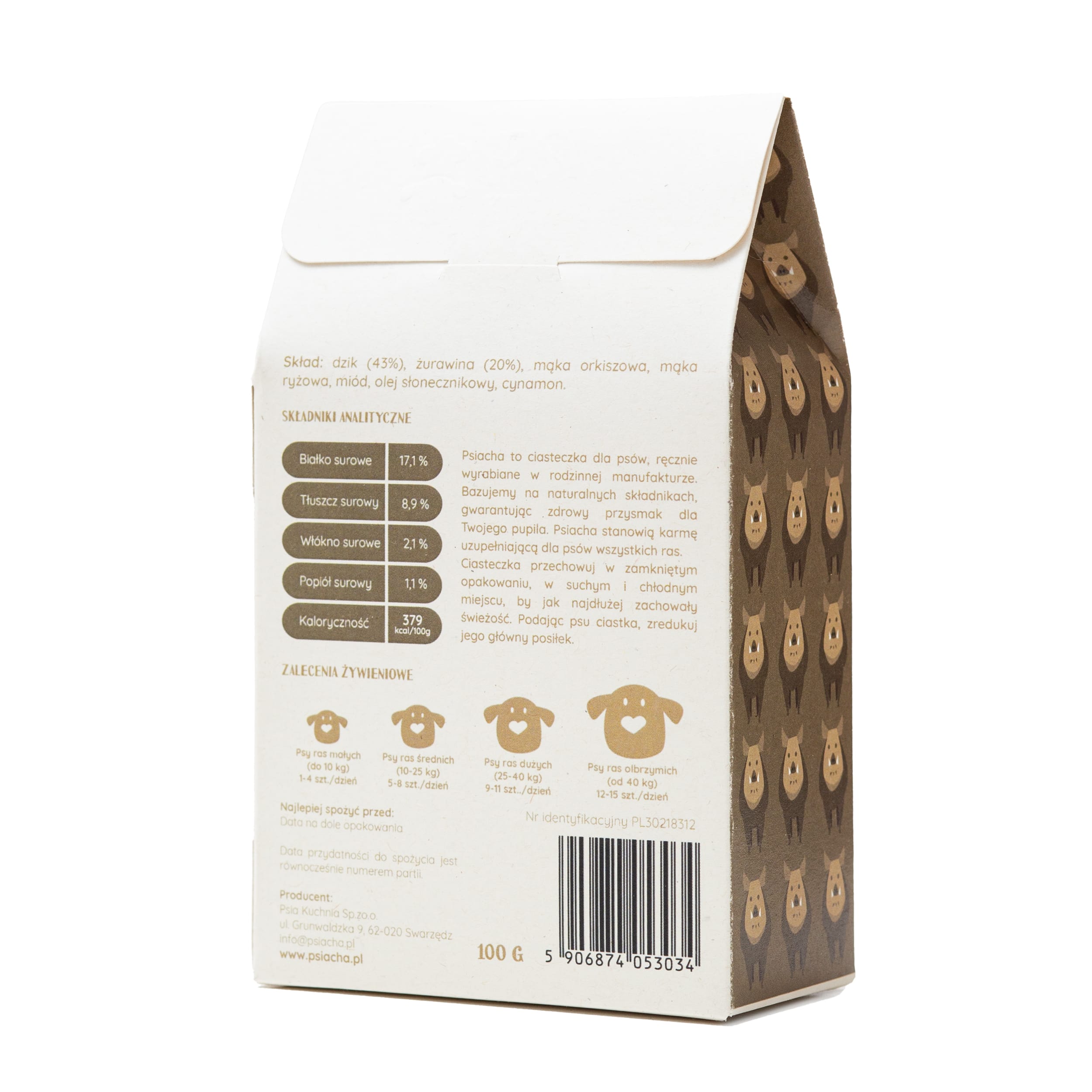 Psiacha z dzika to prawdziwy rarytas. Czerwone, świeże mięso z dzika w połączeniu z żurawiną to idealny przysmak dla psa. Wszystko doprawione cynamonem sprawia, że ciastka są pachnące i słodkie. Dzięki bardzo zdrowemu, najwyższej jakości składowi, Psiacha mają pozytywny wpływ na psie zdrowie – żurawina oczyszcza drogi moczowe zaś cynamon jest źródłem przeciwutleniaczy.