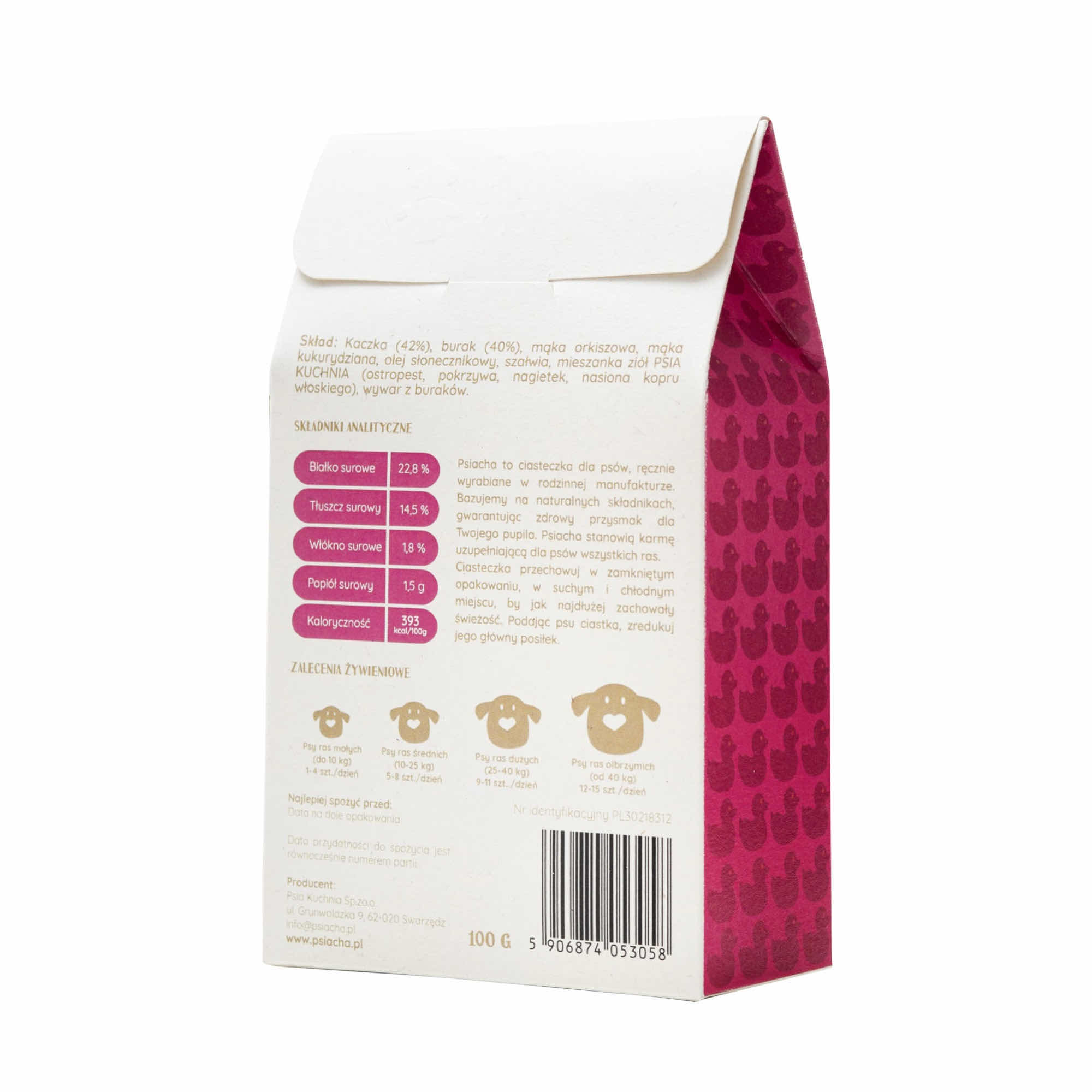 Psiacha z kaczką to słodka, wysoce wartościowa propozycja Psiej Kuchni. Mięso z kaczki jest lekkostrawne, dzięki czemu również psy z wrażliwym przewodem pokarmowym je pokochają. Łatwo przyswajalne, hipoalergiczne białko sprawia, że są idealną pozycją dla psów z problemami alergicznymi.