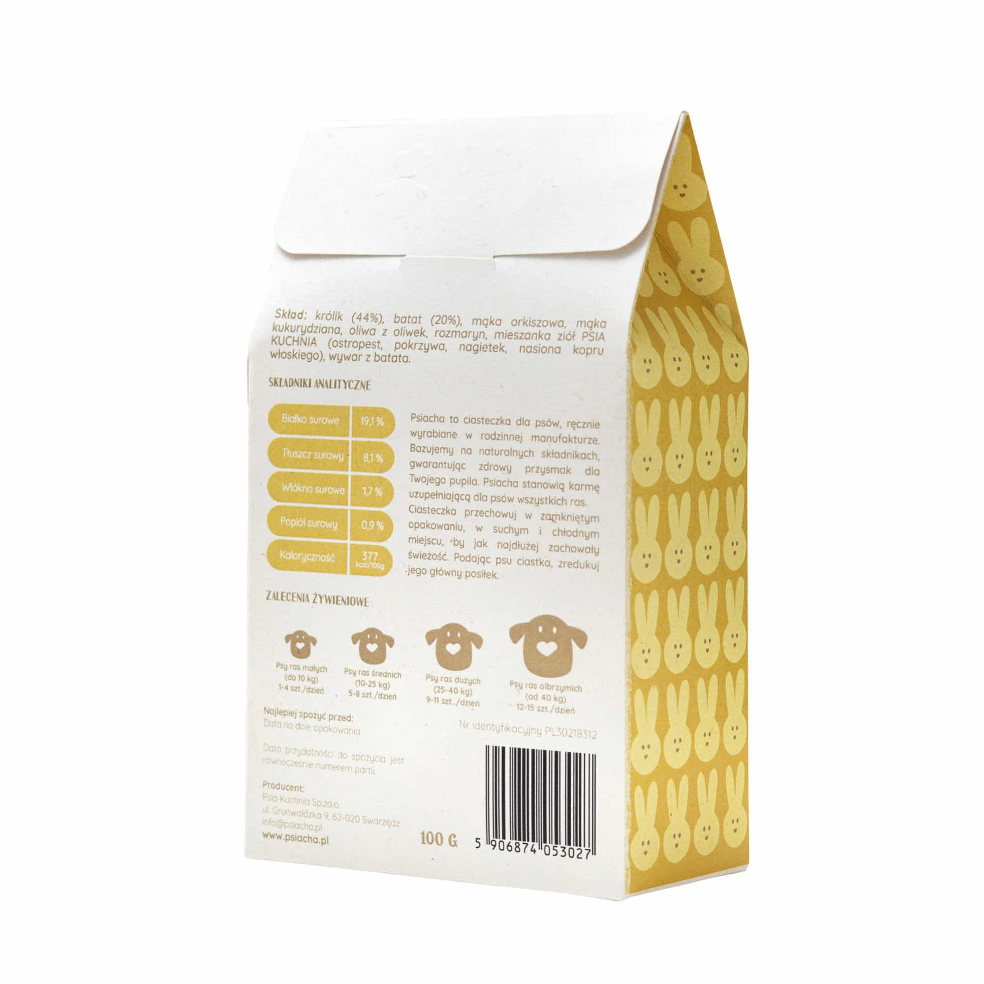 Psiacha z królikiem są pysznym przysmakiem o delikatnym smaku. Królik zaliczany jest do mięs dietetycznych, białych o niskiej zawartości tłuszczu. Świeże i delikatne mięso w połączeniu ze słodkim batatem zadowoli podniebienie niejednego łakomczucha. Charakteru nadaje im rozmaryn, którego olejki eteryczne oraz minerały i witaminy (magnez, wapń, potas, kwas foliowy i witaminy z grupy B) działają antyalergicznie, przeciwzapalnie i przeciwpasożytniczo. Ta przyprawa chroni również wątrobę oraz ma działanie antynowotworowe.