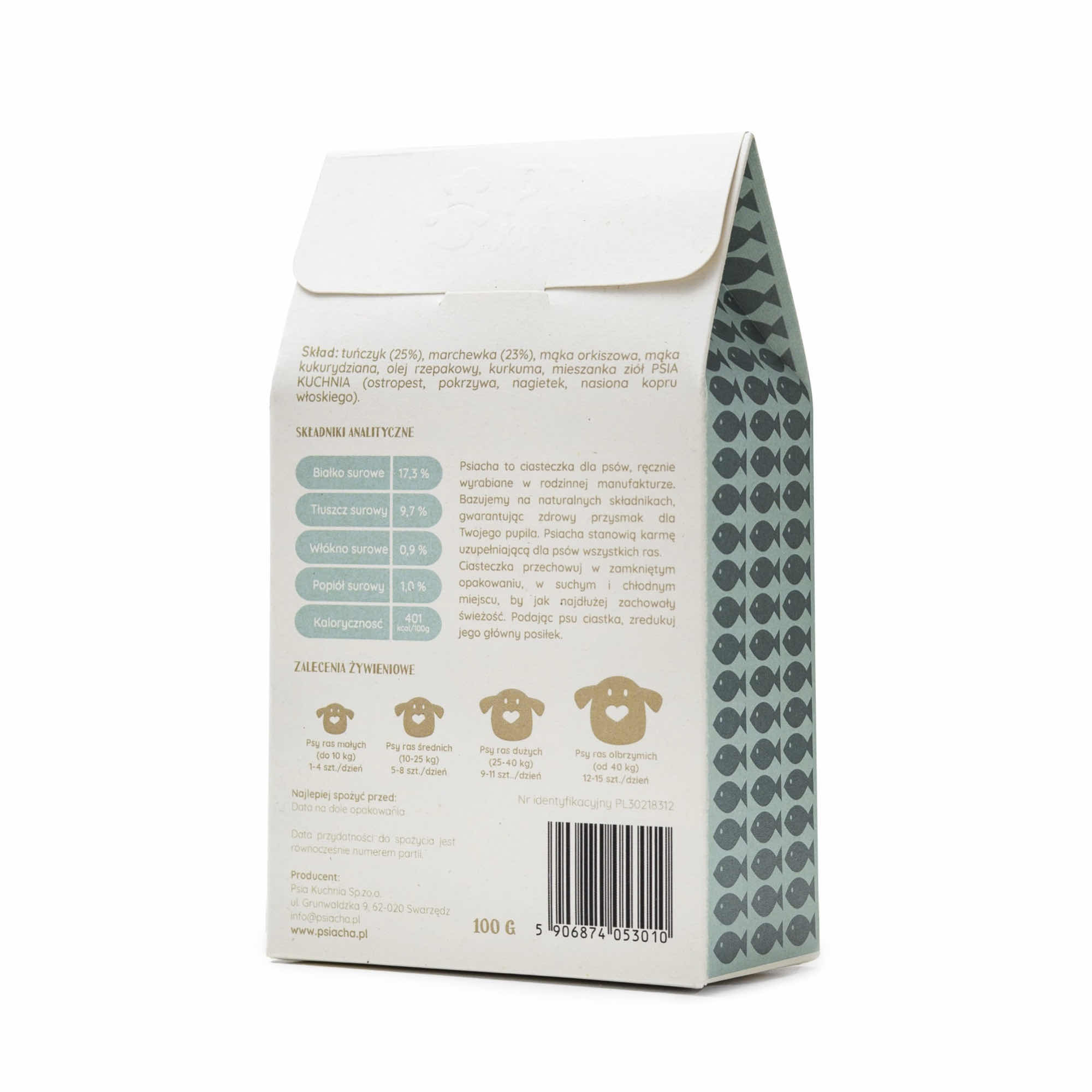 Psiacha z tuńczykiem to aromat ryby i słodycz marchewki – kompozycja, w której rozsmakuje się każdy psiak. Smaczku dodają im mieszanka ziół Psiej Kuchni i kurkuma. Ta ostatnia bogata jest w kurkuminę – silny przeciwutleniacz chroniący m.in. przed nowotworami. Ponadto kurkuma posiada duże ilości potasu, żelaza, miedzi oraz fosforu. Wspomaga pracę wątroby i układu trawiennego.