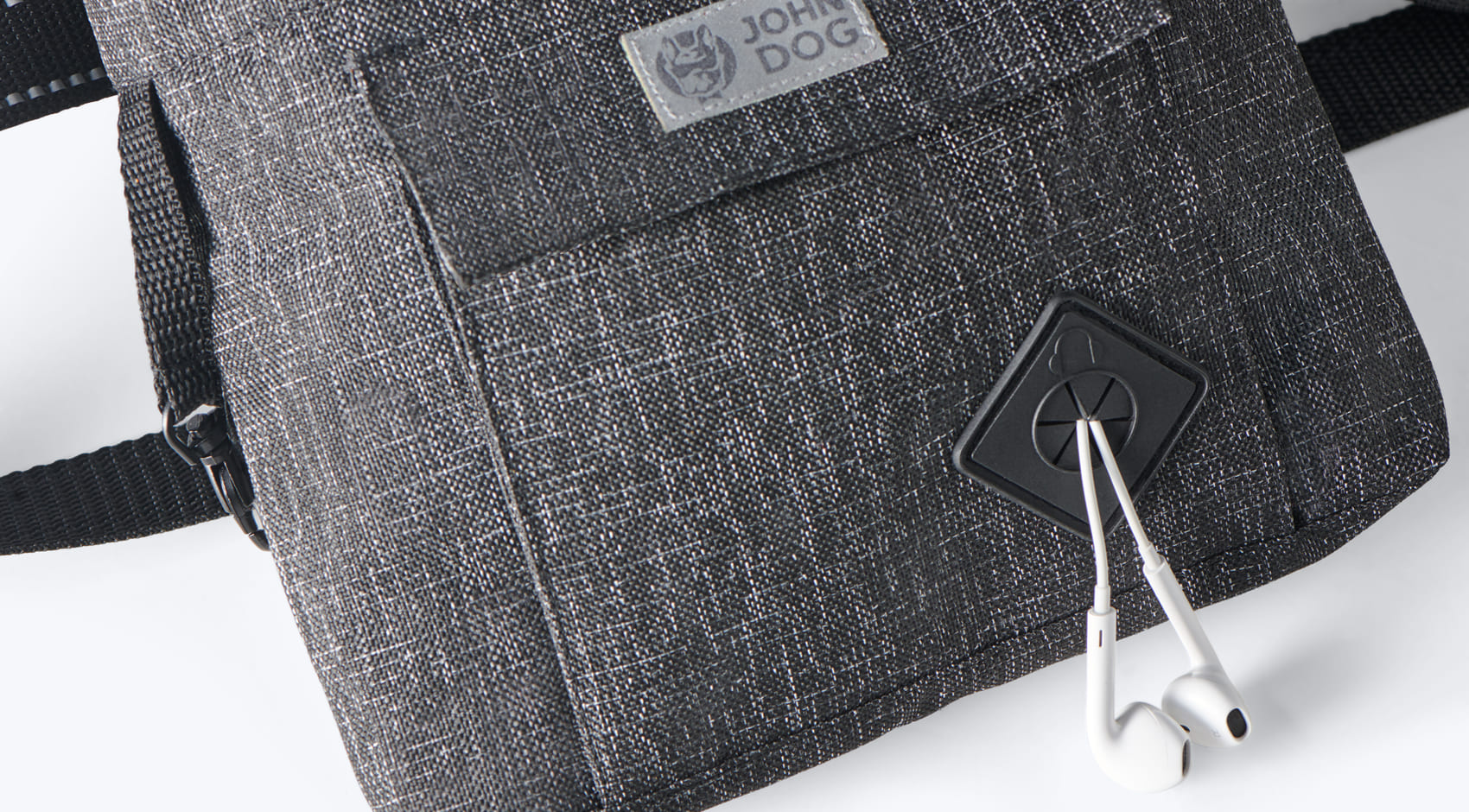 Dzięki paskowi, możesz przepiąć sobie saszetkę w pasie. Dodatkowo saszetka ma odblaskową metkę, więc na każdym treningu czy spacerze będziesz widoczny. Otwór na smakołyki zapinany na bardzo delikatny magnes. W przedniej części saszetkę wyposażono w dodatkową kieszeń z otworem na słuchawki lub worki na odchody. Z tyłu również znajduje się kieszonka, która jest zapinana na zamek, a więc schowasz tam np. telefon. Z boku saszetki znajduje się dodatkowy pasek z karabińczykiem. Wykonana z impregnowanego poliestru, dzięki czemu materiał ma zwiększoną odporność na przepuszczanie wody.