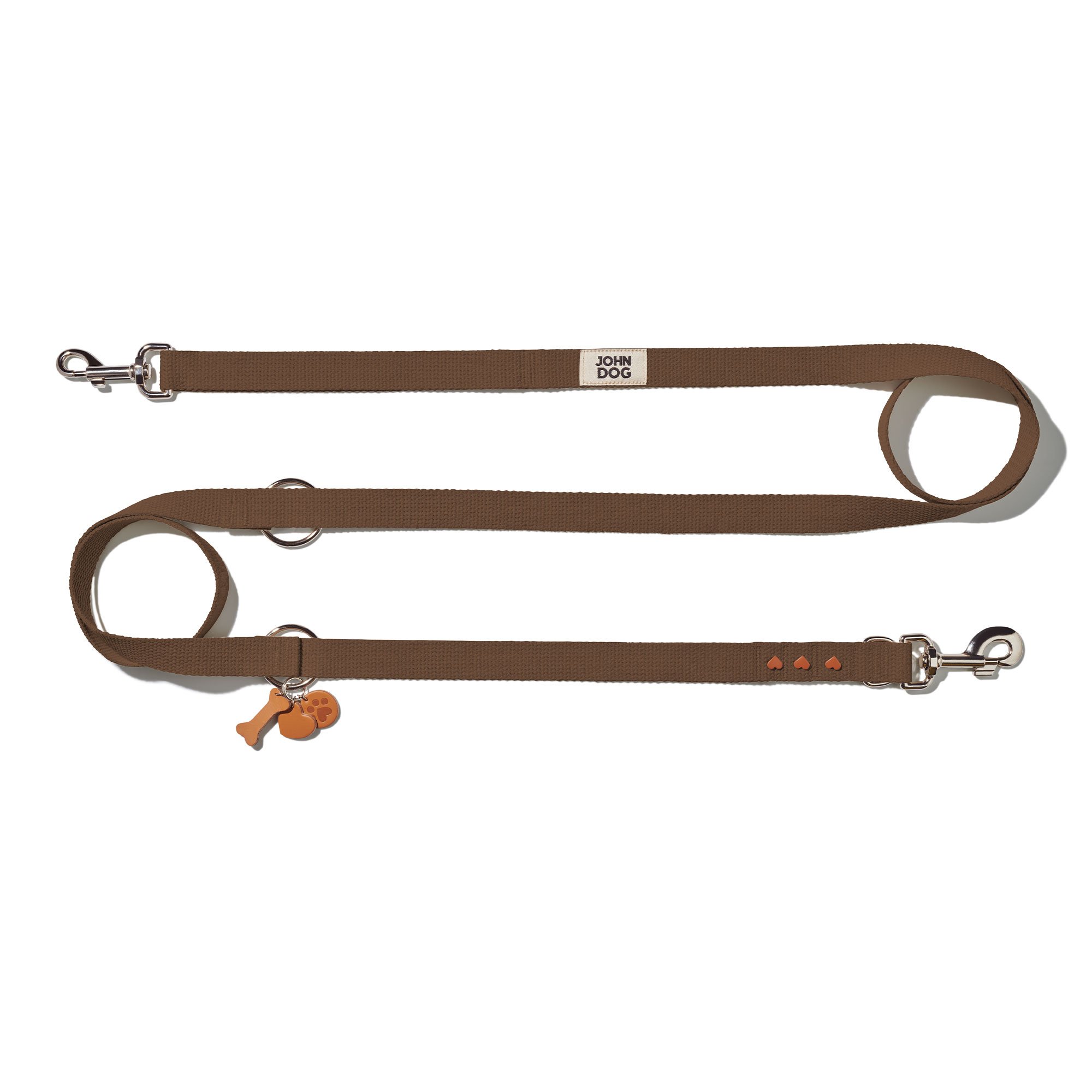 Smycz przepinana John Dog Manifest w eleganckim brązowym kolorze wykonana w 100% z bawełny. Z dwóch stron wytrzymałej taśmy znajduje się karabińczyk. Jeden można przypinać do przymocowanych do smyczy kółek, regulując w ten sposób jej długość (120-240cm). Wyróżniającym elementem jest skórzana zawieszka z trzema symbolicznymi przypinkami reprezentującymi filozofię kolekcji Manifest – manifest miłości, zrozumienia i odpowiedzialnej opieki nad ukochanymi czworonogami.