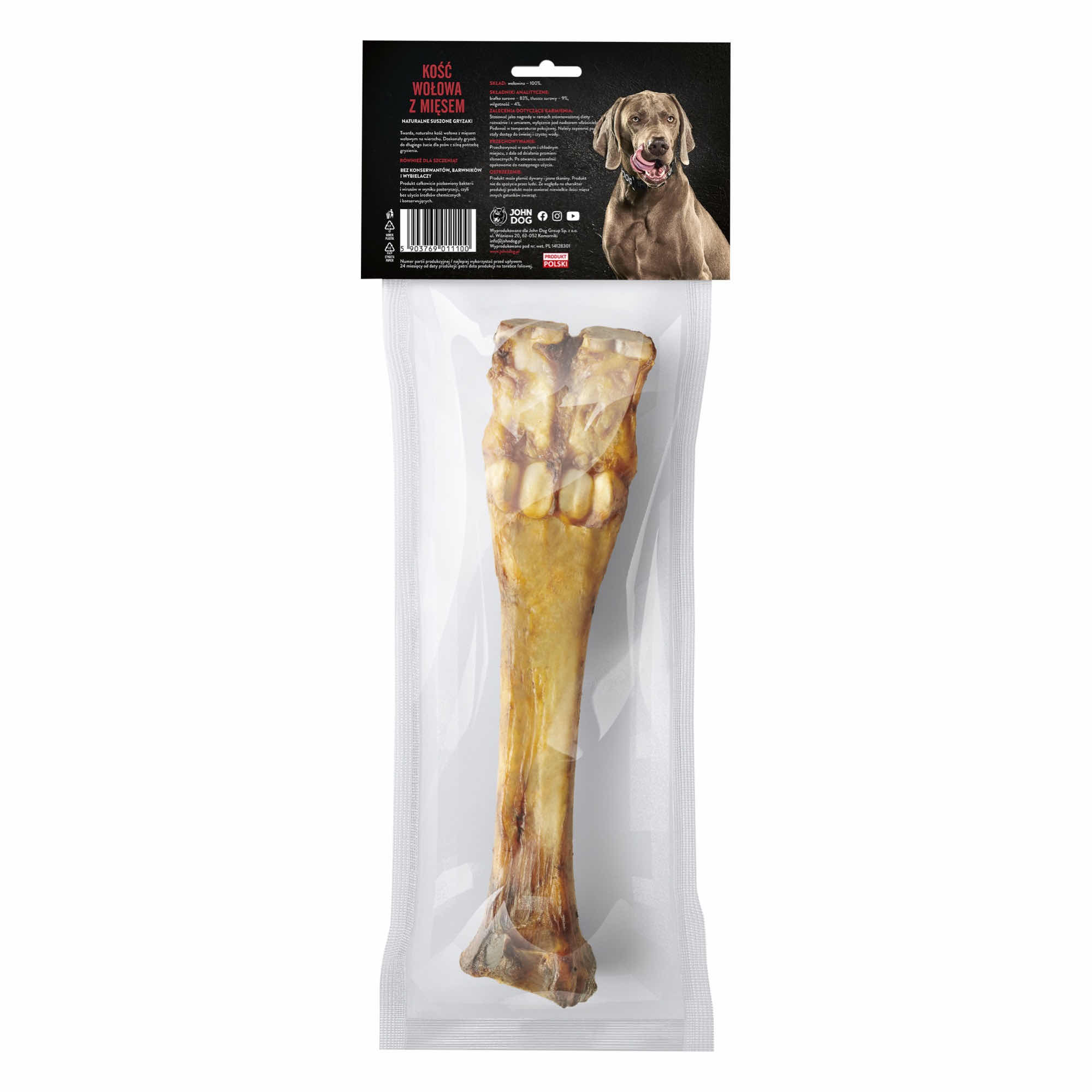Naturalnie suszona kość wołowa, szczelnie zapakowana w opakowanie foliowe. Prawdziwy rarytas dla każdego psiego łowcy. Idealnie jako upragniona nagroda, która dzięki kawałkom suszonego mięsa perfekcyjnie zajmie psa, gwarantując długie i smakowite żucie.