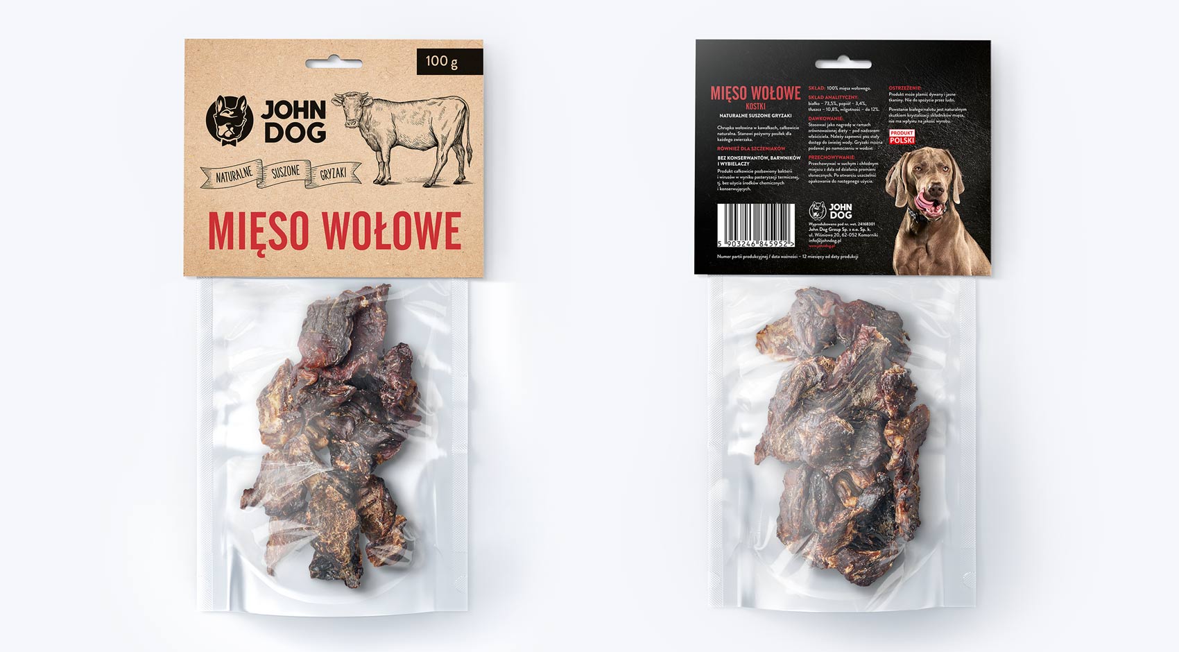 Wyprodukowany w Polsce na bazie wyłącznie naturalnego surowca pochodzącego również z Polski, który został poddany procesowi suszenia w stosunkowo niskich temperaturach, a następnie pasteryzacji termicznej. Proces suszenia zapewnia zachowanie cennych wartości odżywczych użytych składników, dodatkowo tak suszone produkty nie zawierają popiołu, który powstaje w procesie wędzenia. Pasteryzacja termiczna zapewnia całkowite bezpieczeństwo epidemiologiczne, bez użycia środków chemicznych i konserwujących.