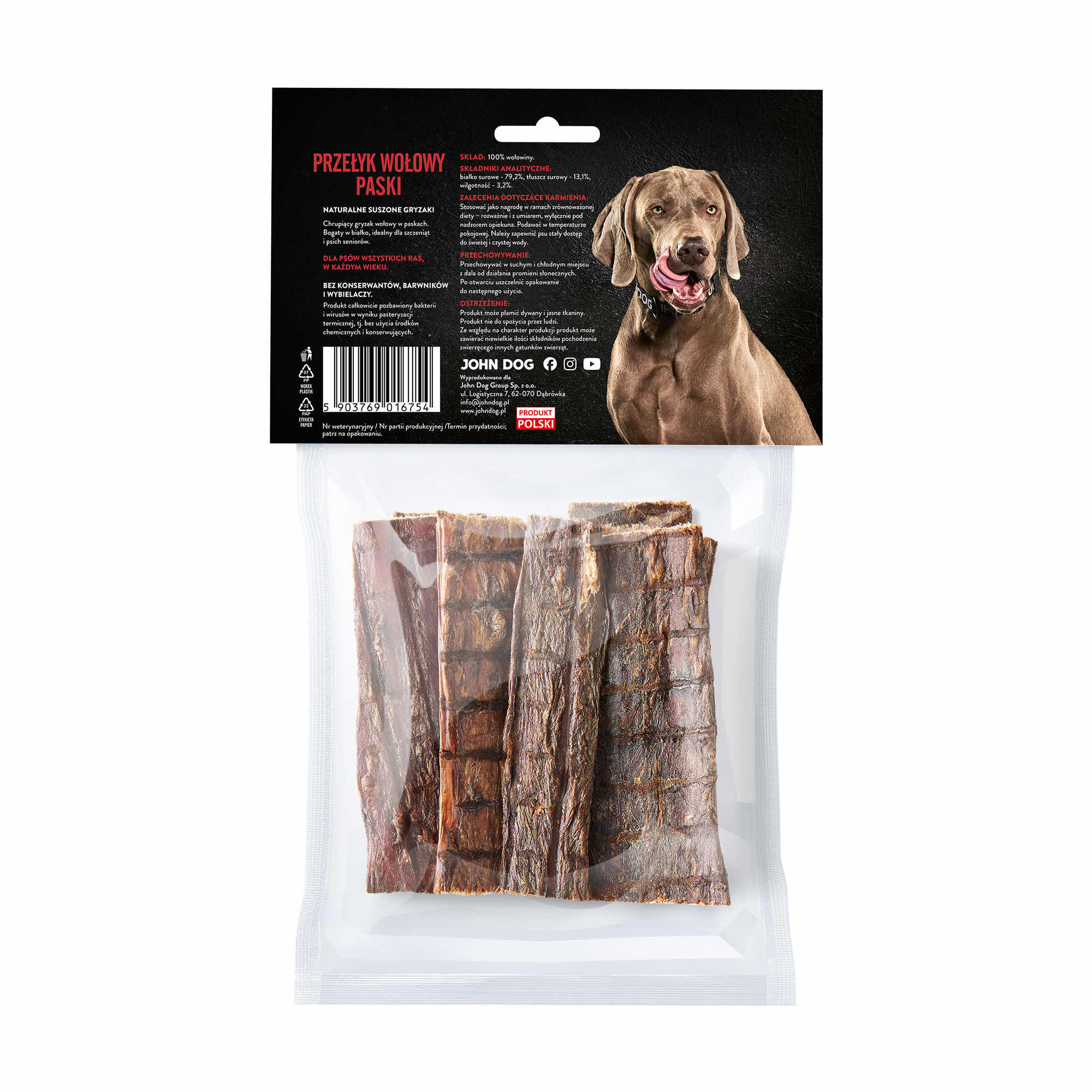 Suszony przełyk paski to w 100% naturalny, monobiałkowy przysmak stworzony z myślą o psach w każdym wieku. Dzięki swojej średnio miękkiej strukturze idealnie sprawdza się jako nagroda dla psa podczas treningu oraz gryzak dla szczeniaków i psów małych ras. Ten smakowity przysmak można połamać na mniejsze kawałki i uzupełnić nimi zabawki interaktywne lub podawać jako nagrodę. Przysmak został wyprodukowany w Polsce metodą suszenia w niskich temperaturach, a następnie poddane pasteryzacji termicznej, zachowując niezbędne wartości odżywcze bez sztucznych dodatków, konserwantów czy wybielaczy.