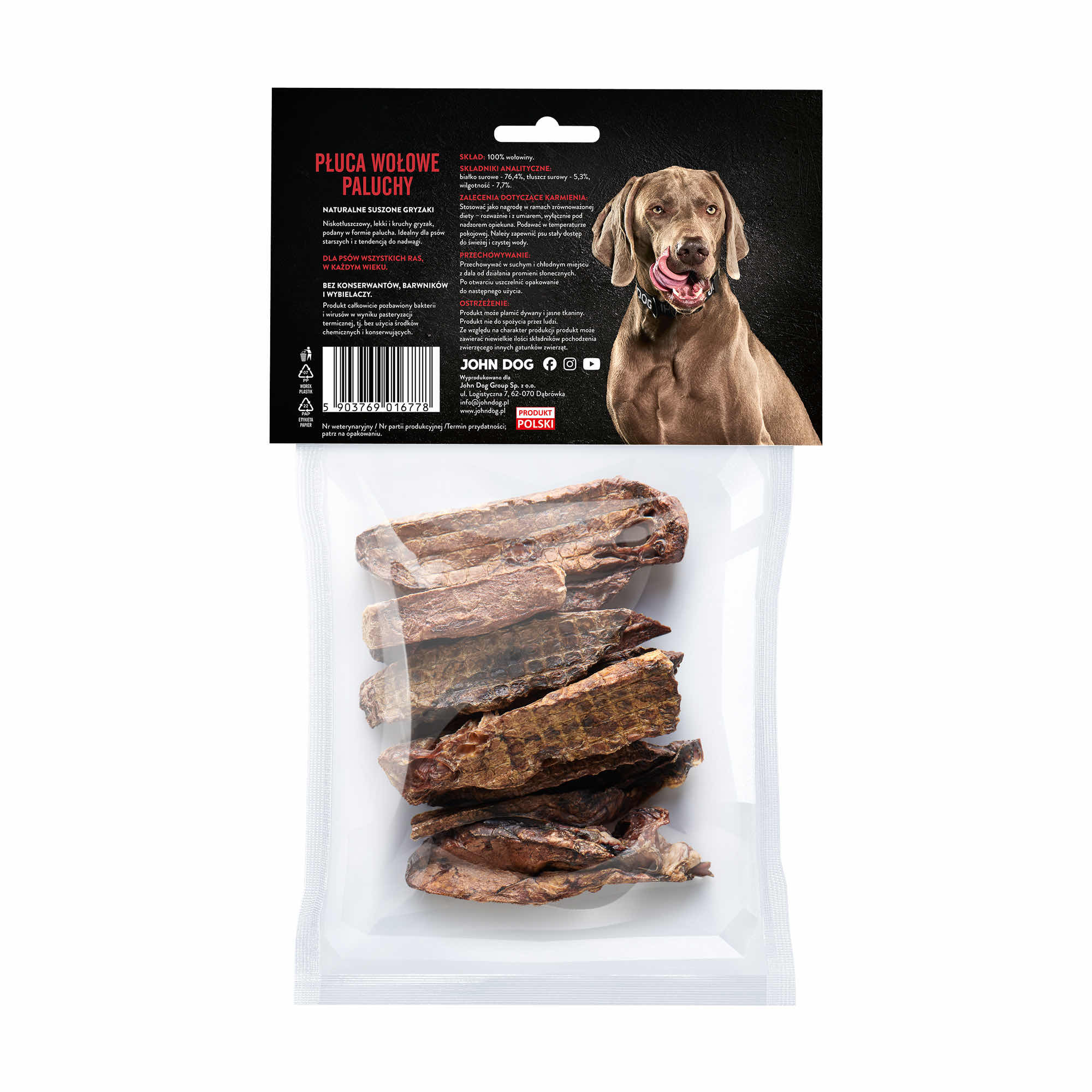 Płuca wołowe paluchy to 100% naturalny gryzak anatomiczny, który stanowi idealną przekąską dla psów wszystkich ras i w każdym wieku. Przysmak jest niskotłuszczowy i lekkostrawny, dzięki czemu sprawdzi się dla psów z tendencją do nadwagi oraz z wrażliwym żołądkiem. Dzięki swojej miękkiej strukturze i łatwości gryzienia, płuca wołowe sprawdzą się doskonale jako smakołyk dla psów seniorów oraz szczeniaków. Średnio miękka formuła sprawia, że gryzak można łatwo dzielić na mniejsze kawałki, co czyni go doskonałą nagrodą podczas nauki i treningu behawioralnego.