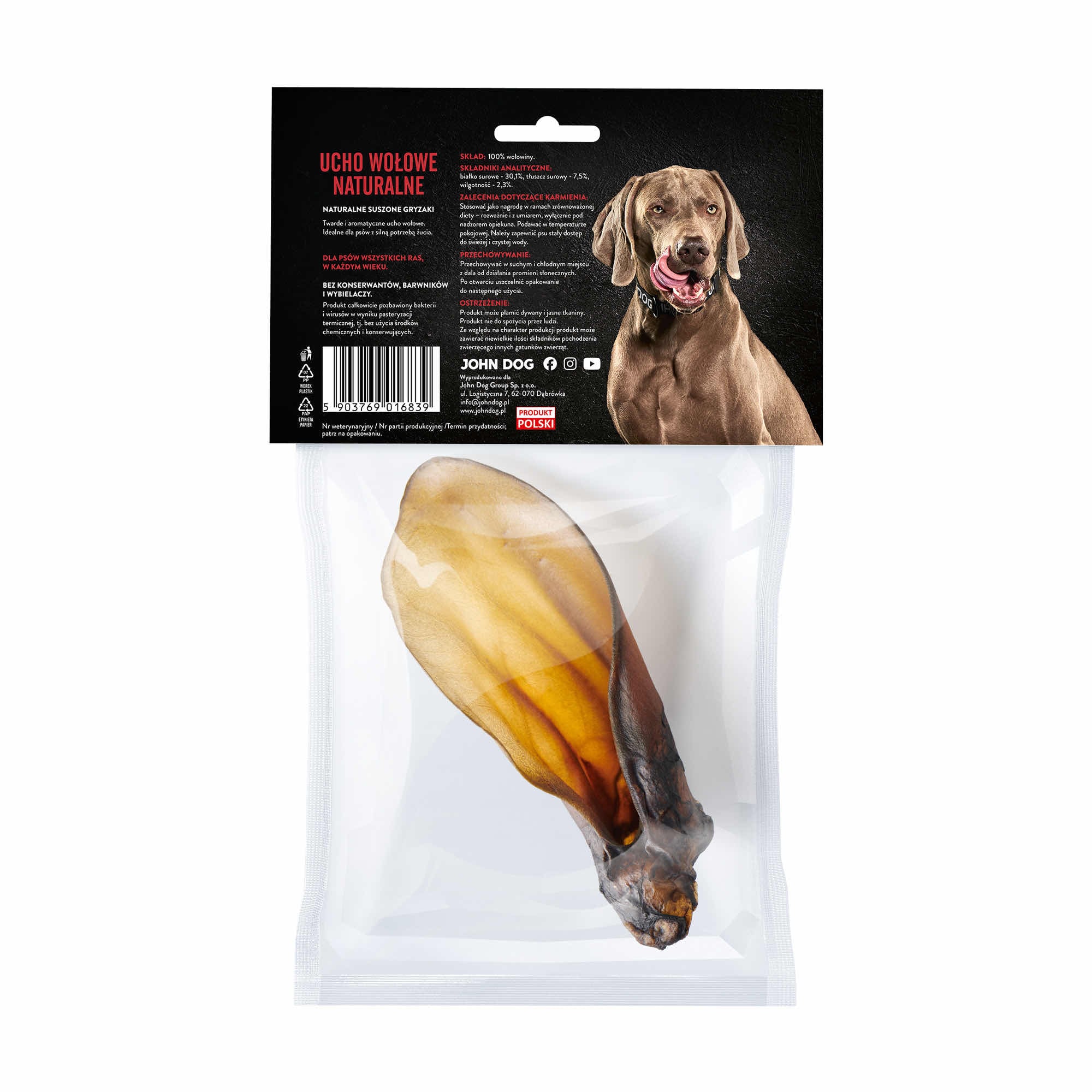 Przysmak składa się w 100% z ucha wołowego – produkt naturalny, bez sztucznych dodatków i bez gliceryny. Suszone gryzaki dla psa powstają z wysokiej jakości surowca, suszonego w stosunkowo niskich temperaturach, a następnie pasteryzowanego termicznie. Taki proces pomaga zachować wartości odżywcze i jednocześnie zapewnia bezpieczeństwo mikrobiologiczne, bez użycia chemii i bez konserwantów dla psa. Produkt nie jest wędzony, więc nie zawiera popiołu. Ucho wołowe dostarcza naturalnych białek strukturalnych, takich jak kolagen, wspierających elastyczność tkanek oraz kondycję skóry i sierści.