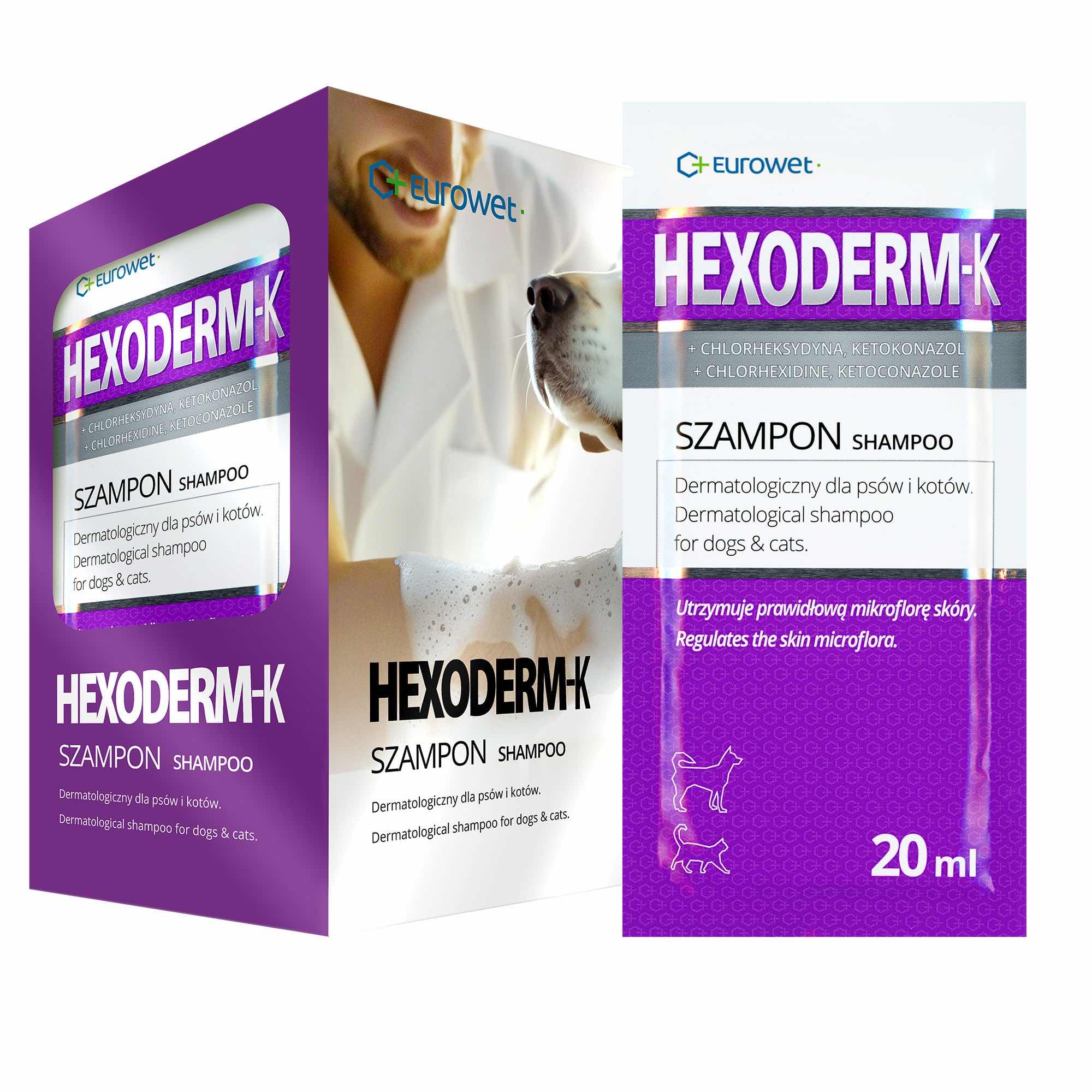 Szampon HEXODERM-K ma przede wszystkim działanie regulujące mikroflorę skóry. Stabilizuje pH skóry oraz zapobiega jej wysuszaniu poprzez pozostawienie cienkiej warstwy tłuszczowo-białkowej. Chlorheksydyna i ketokonazol zwalczają szkodliwe mikroorganizmy (bakterie, drożdżaki oraz dermatofity), które powodują szereg dolegliwości skórnych. Zawarte w płynie łagodne środki myjące pozwalają na jego częste stosowanie. Jako element pielęgnacyjny stosować przez cały okres właściwego leczenia stanów zapalnych skóry.