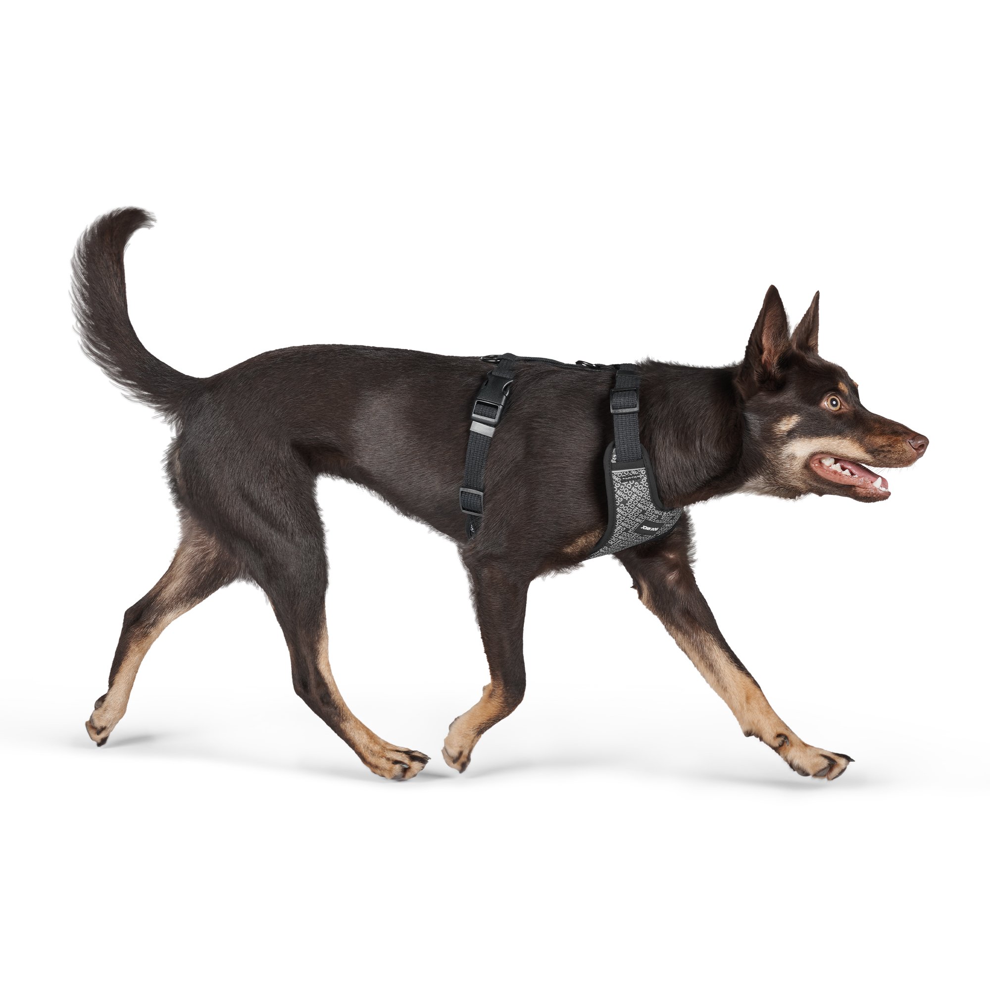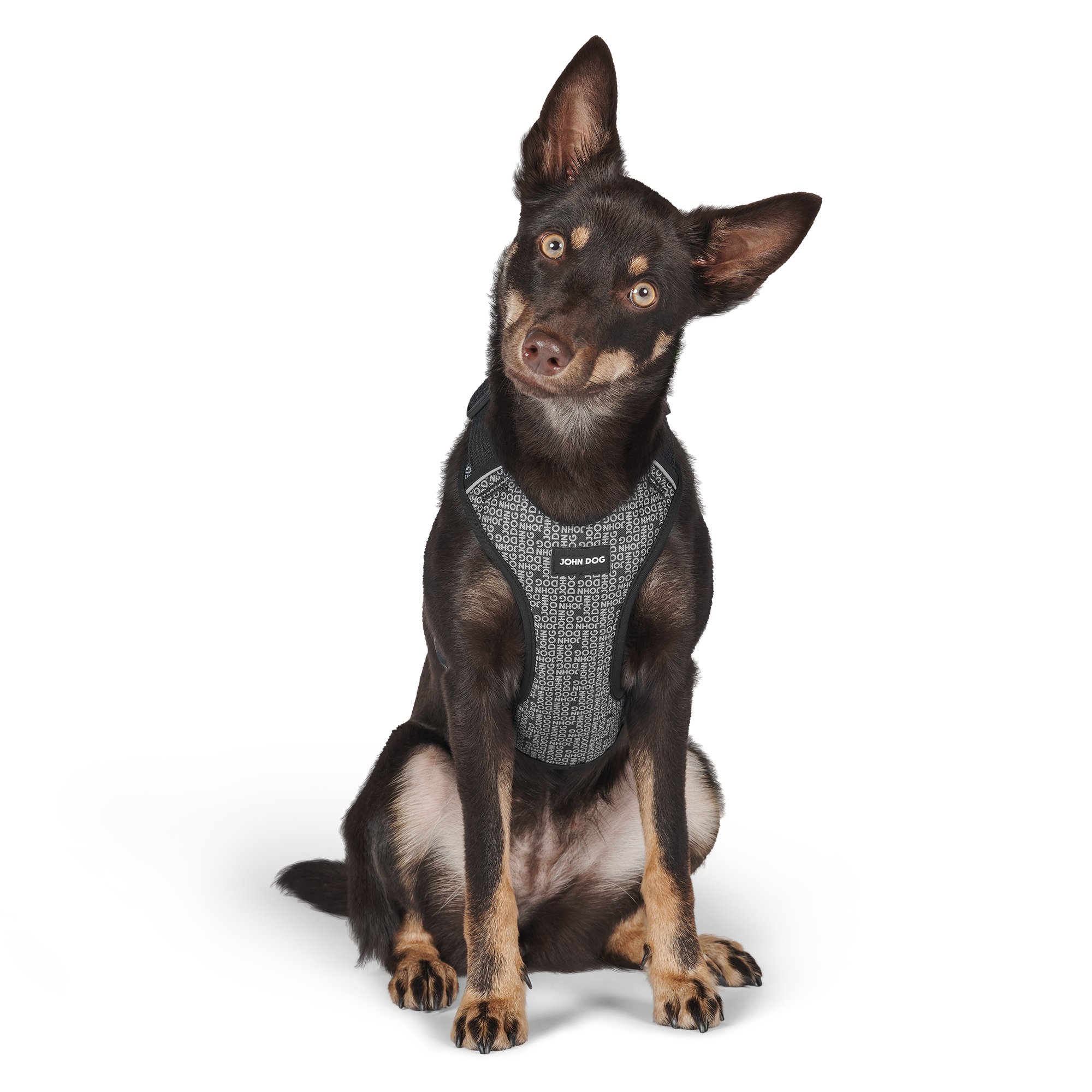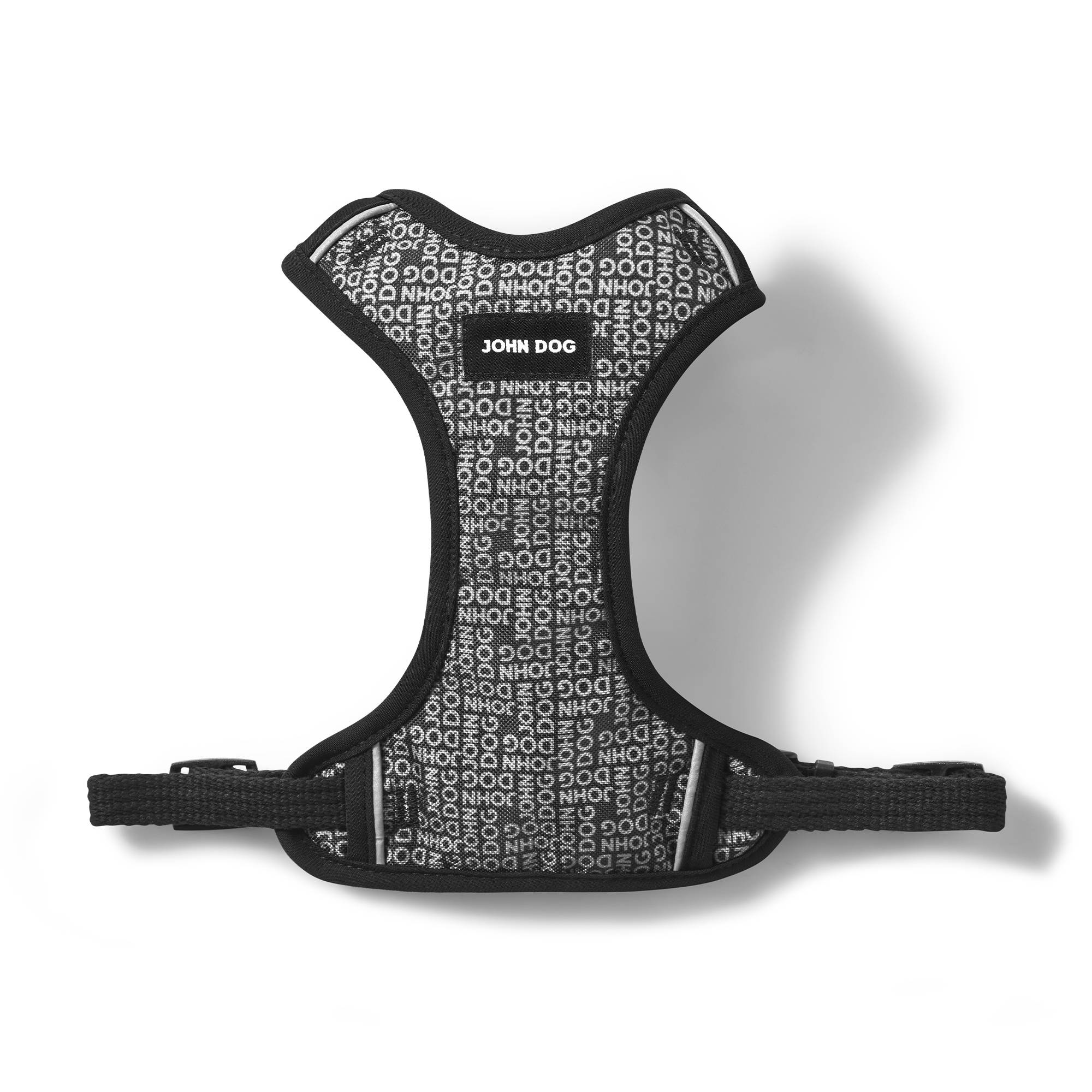 Taśma została wykonana w 100% z bawełny o doskonałej wytrzymałości. Oryginalny wzór i czarny kolor nadają tym szelkom niezwykle unikalny charakter. Nowoczesny design przedstawia powtarzający się napis „JOHN DOG”, tworząc elegancki wzór w odcieniach szarości, bieli i czerni.