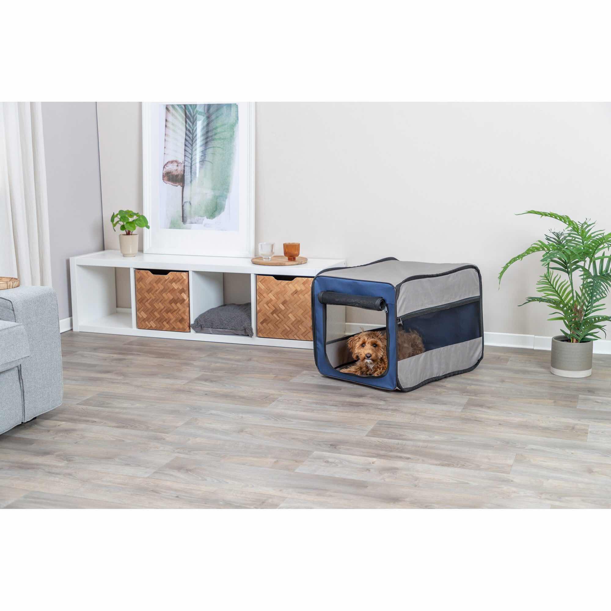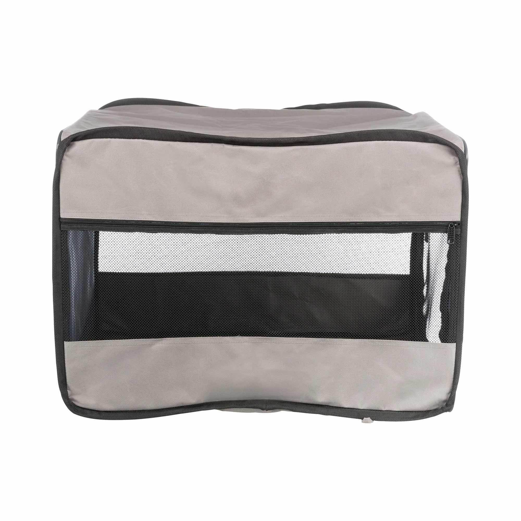 Torba ma formę zabudowanej budki, która może pełnić funkcję legowiska. Dzięki funkcji pop-up, jej montaż odbywa się błyskawicznie. Z przodu i po bokach znajdują się wkładki z siateczki, które zapewniają cyrkulację powietrza oraz nie ograniczają widoku pupilowi. Klatka jest zapinana na zamek błyskawiczny z różnych stron. Dzięki umieszczonym rzepom, przedni materiał można zawinąć w rulon, który pozwala na pozostawienie otworu i swobodne przemieszczanie się czworonoga. Na tylnej ścianie znajduje się pojemna kieszeń zewnętrzna, w której możesz umieścić najpotrzebniejsze rzeczy.