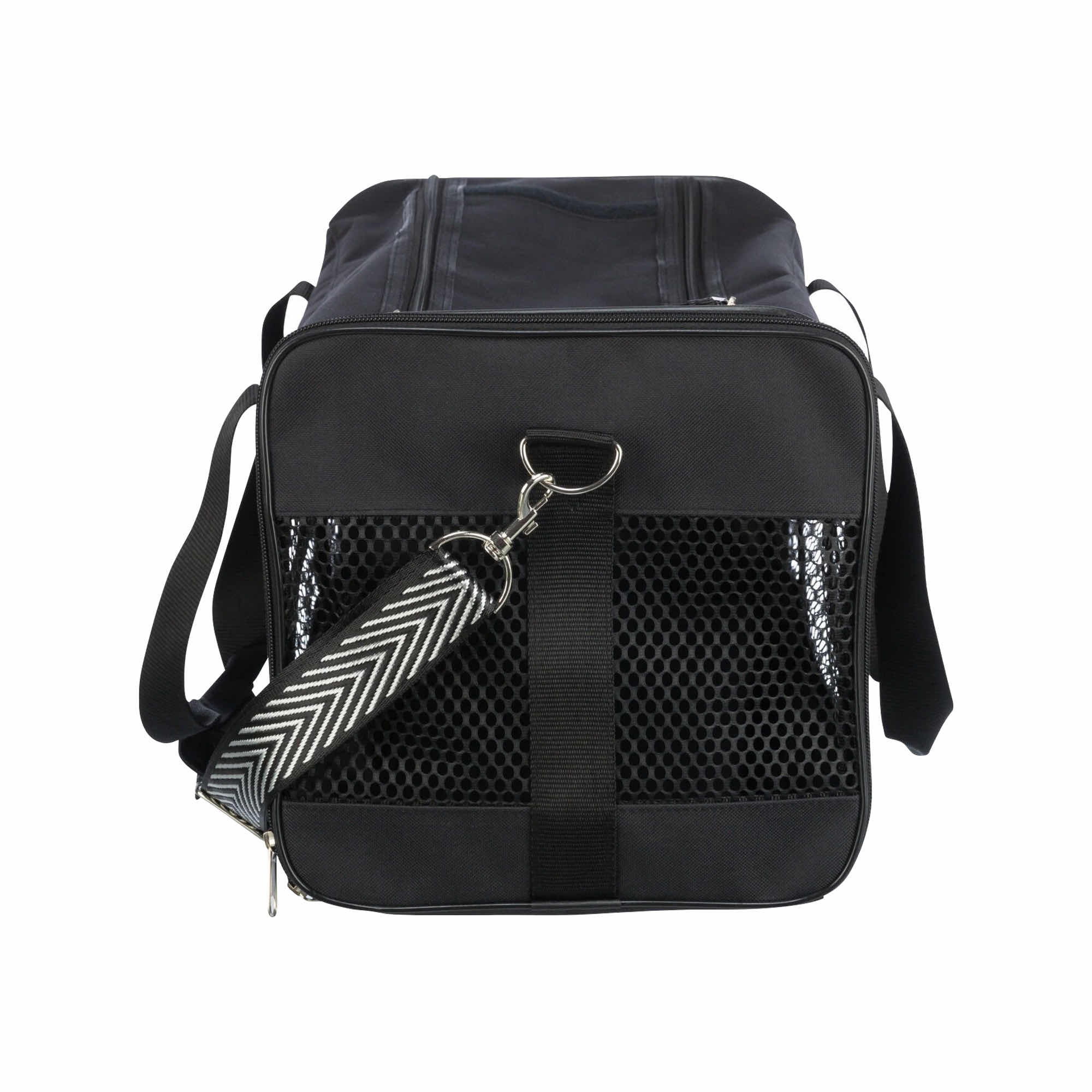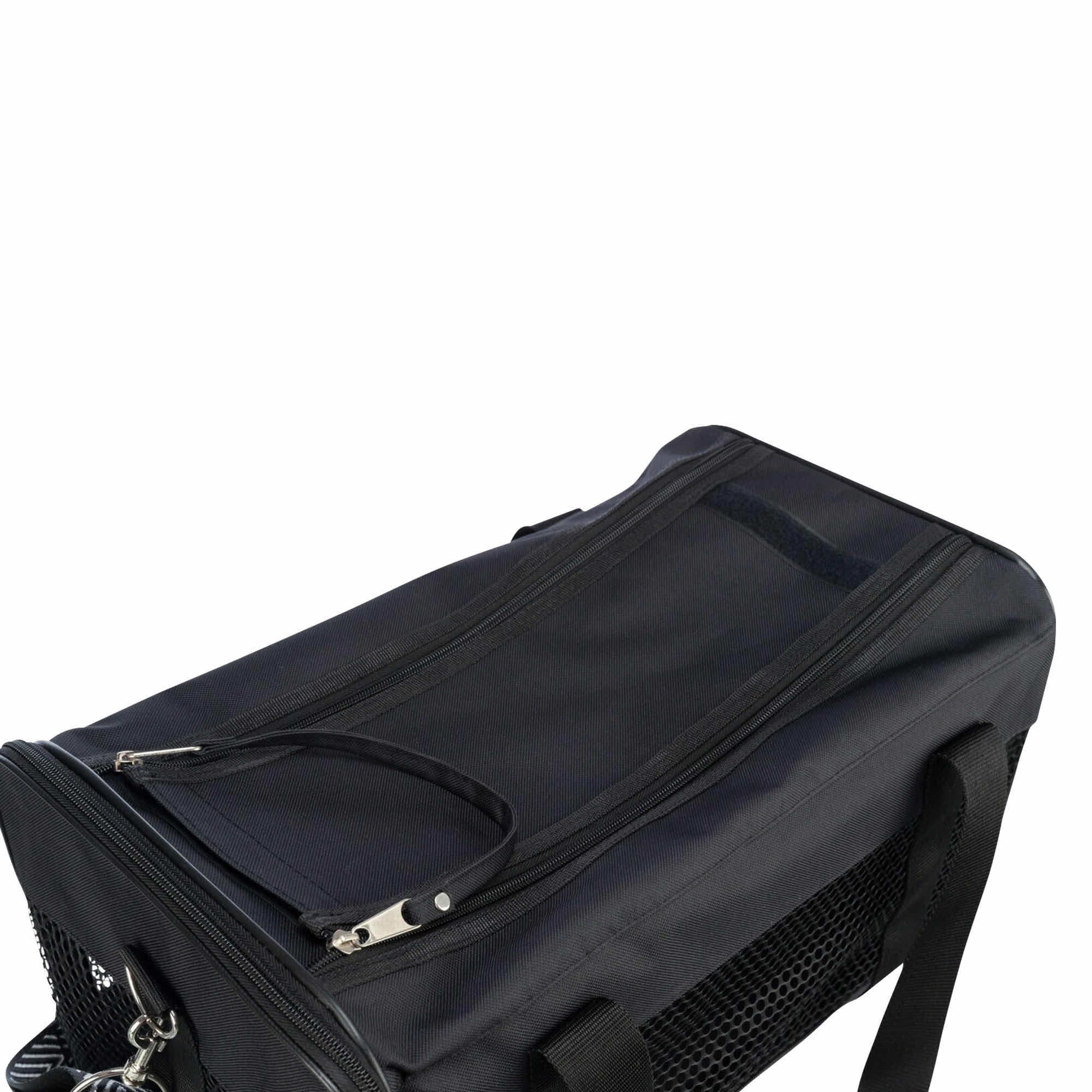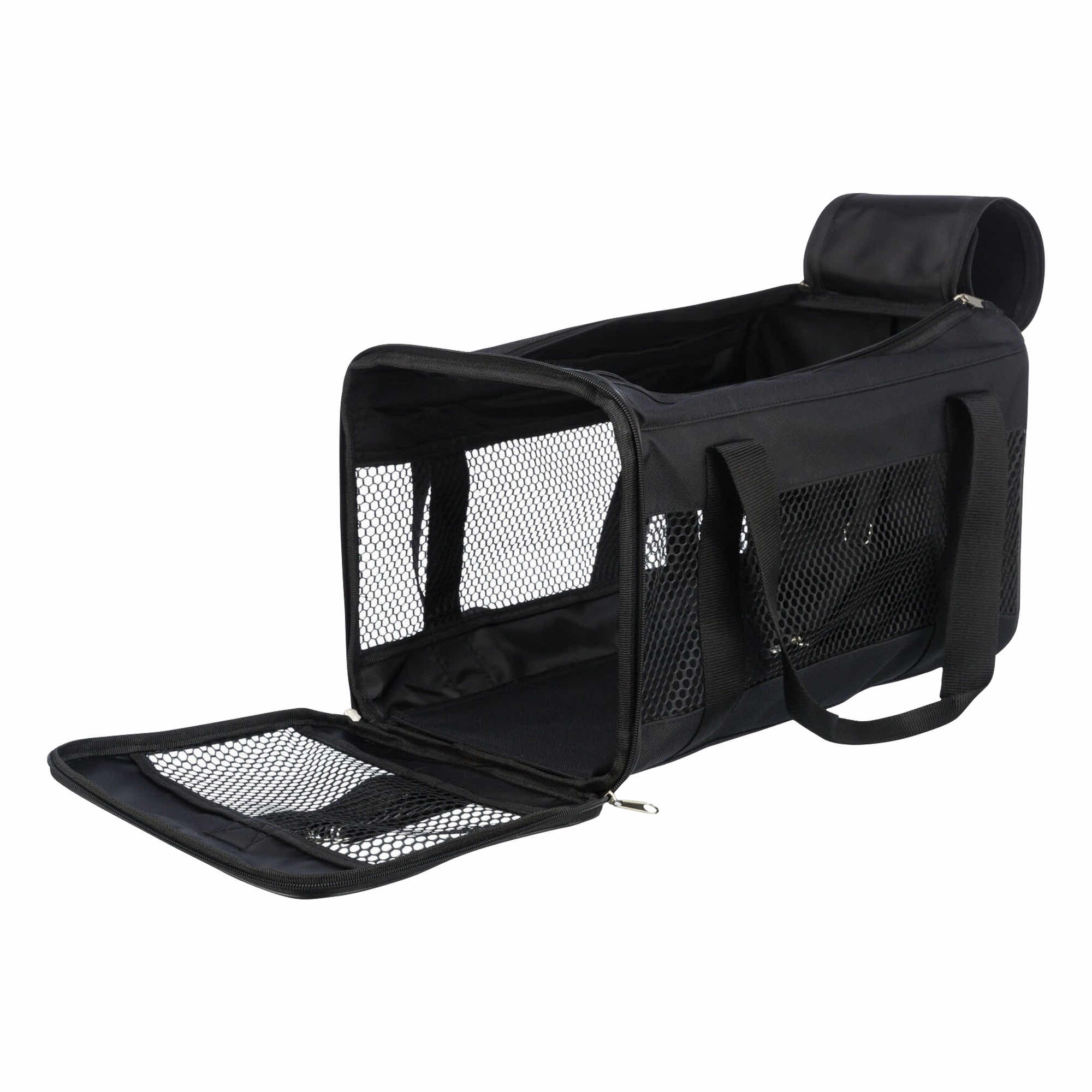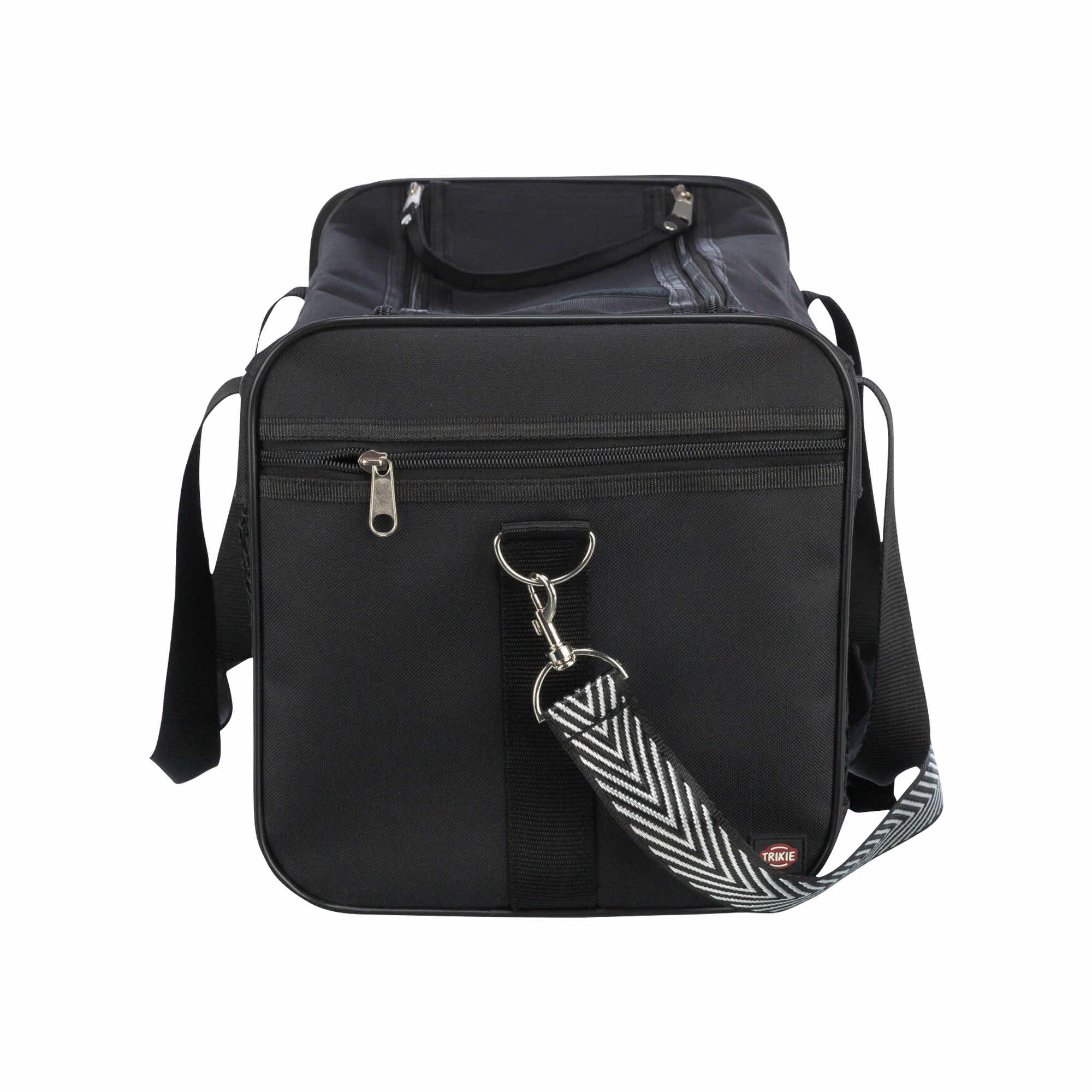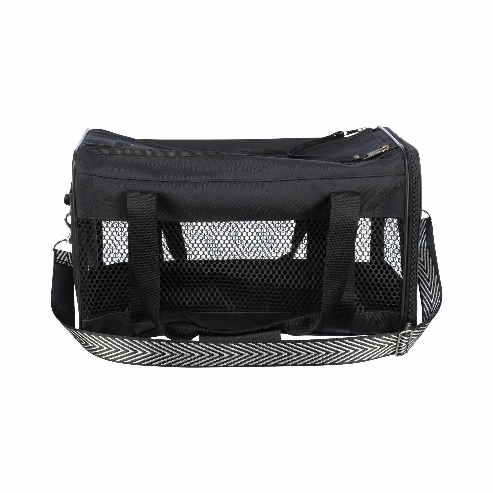 Dzięki otwieraniu od góry wkładanie i wyjmowanie zwierzęcia jest szybkie i bezproblemowe. Praktyczna kieszeń zewnętrzna umożliwia przechowywanie drobiazgów, a zdejmowany pas naramienny zapewnia komfort noszenia. Dodatkowym atutem jest zintegrowana krótka smycz, która zwiększa bezpieczeństwo pupila, oraz zdejmowana podstawa, ułatwiająca utrzymanie czystości. Torba wykonana jest z wytrzymałego poliestru, co gwarantuje trwałość i łatwą pielęgnację.